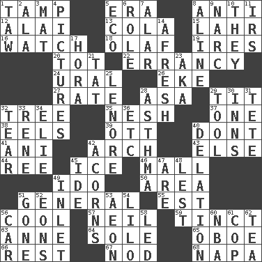 ACROSS 1. Pack (down) 5. Period 8. Against 12. Jai ____ 13. Root beer relative 15. Cowardly lion portrayer 16. Observe 18. Norwegian king 19. Angers 20. Small child 22. The state or an instance of erring 24. Mountain range 26. Supplement with great effort 27. Pace 28. White ___ sheet 29. Teat (slang) 32. Woody plant 35. Soft 37. Single 38. Snakelike fish 39. Baseball player Mel 40. Do not 41. Black tropical American cuckoo 42. Bowlike part 43. Otherwise 44. To sift 45. Frozen water 46. Promenade 49. Wedding promise 50. Length times width 51. Commissioned military rank 55. Eastern Standard Time (abbr.) 56. Calm and collected 57. Famous astronaut Armstrong 59. Tinged 63. Singer Murray 64. Flatfish 65. Mitch Miller's instrument 66. Remainder 67. Dreamland 68. California wine valley DOWN 1. The 23rd letter of the Hebrew alphabet 2. Wing 3. Floor protector 4. Photos 5. Environmental prefix 6. Hero or heavy, e.g. 7. Having or resembling wings 8. Place in a line 9. Drug cop 10. Those people 11. Big collection agency 14. Anew 17. Israeli folk dance 21. Make lace 23. Alias (abbr.) 25. Poe poem 28. Respiratory problem 29. Utensil 30. Restaurants 31. False hair 32. Pull apart 33. French philosopher Descartes 34. Writer Wiesel 36. And so on (abbr.) 40. Conveyance 42. Oak nuts 45. Binary compound 47. "We ___ not amused" (Victoria) 48. For fear that 49. An arm off of a larger body of water 51. Went 52. Immeasurably long periods of time 53. Period of immesurable duration 54. _ and Stitch 56. Automobile 58. Directed 60. Basketball assoc. 61. Police officer (slang) 62. Beverage made from leaves