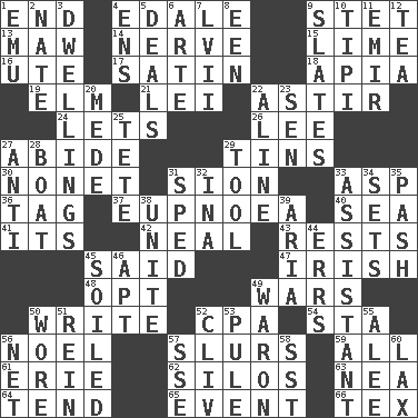ACROSS 1. Conclusion 4. Peak District village in England 9. Proofreading order 13. Opening into something insatiable 14. Impudent aggressiveness 15. Citrus frut 16. Shoshoni 17. Smooth fabric 18. Capital of Western Samoa 19. Shade tree 21. Flowery wreath 22. Moving or stirring 24. Allows 26. Area sheltered from the wind 27. Stay 29. Canisters 30. Music written for nine 31. The Jewish people; Israel 33. Viper 36. Label 37. Normal relaxed breathing 40. Ocean 41. It is 42. Anneal 43. Musical pauses 45. Alleged 47. From or relating to Ireland 48. Elect 49. Armed conflicts 50. Compose 52. Tax preparer (abbr.) 54. R.R. building 56. Christmas carol 57. Disparaging remarks 59. 100% 61. One of the Great Lakes 62. Grain storage towers 63. Teachers' org. 64. Look after 65. Happening 66. John Ritter's dad DOWN 1. Australian flightless bird 2. Nathan's nickname 3. Residences 4. Followers of ems 5. Allots cards 6. Johnson of "Laugh-In" 7. 57 in ancient Rome 8. Car or cant ending 9. Chalkboards 10. Native american tent (variation) 11. Independent ruler or chieftain 12. Afternoon social gathering 20. Ancient Persian 22. Place in a line 23. Elected rep. 25. Wig 27. Opposed to 28. Water vessel 29. Implement 31. Hurried 32. _ tizzy (2 wds.) 33. Aide 34. Arranges properly for use 35. Romantic infatuation 38. Join together 39. Roberta Peters solo 44. Blunders 45. Dirtied 46. Fitting 49. Make _____ (do battle with) 50. Had on 51. It's straight from the horse's mouth 52. 154 in Roman numerals 53. Whimper 55. Toward shelter 56. Remaining after all deductions 57. Compass dir. 58. Fast jet (abbr.) 60. Not strict