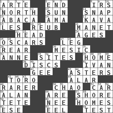 ACROSS 1. Johnson of "Laugh-In" 5. Conclude 8. Big collection agency 11. 0 degrees 13. Player for Phoenix 14. Fastener 15. Phillipine bananalike plant 16. Housemaid (var.) 17. Polynesian shrub of the pepper family 18. French article 19. Reuben's nickname 21. French painter Edouard 22. Froth on beer 24. Grows older 25. Motion picture awards 27. Part of a journey 29. Stern 30. Of or pertaining to a meson 32. Singer Murray 33. Locates 35. Residence 39. Plates 41. "Terrible" tsar 42. Unit of force equal to gravity 43. Michaelmas daisies 45. "Corrida" creature 48. Having or resembling wings 49. Less widely known 50. US Secretary of Labor Elaine L. _ 52. 4-wheeled motor vehicle 55. Actor Alda or Thicke 56. "We ___ not amused" (Victoria) 57. Dinah or Pauly 59. False hair 60. Born 61. Dwellings 62. Compass dir. 63. Snakelike fish 64. Trial DOWN 1. Of or related to the anus 2. Loose flowing garment 3. File 13 4. And so on (abbr.) 5. Son of Isaac 6. Unfeeling 7. Heredity factor (abbr.) 8. Lacking in sense or substance 9. All-night dance parties 10. Petty quarrel 12. Ethiopian city, capital of Harari 14. Heroin 20. Begley and Asner 21. Wise men 23. Having ears or earlike features 25. Mouth or opening 26. Elected rep. 27. Area sheltered from the wind 28. Double-curved letter 30. Mountains (abbr.) 31. Riviera of "Kiss of the Spider Woman" 33. Compass dir. 34. Frozen water 36. Conquer 37. Third mo. 38. Followers of ems 40. Composer Stravinsky 43. American Automobile Association (abbr.) 44. Splash clumsily 45. Falsehoods 46. Speak pompously 47. French philosopher Descartes 49. Assign a rank or rating to 50. Algonquian 51. The bottom of a shoe or boot 53. Ancient Greek god of war 54. Respite 56. One (Scot) 58. Being at a high temperature