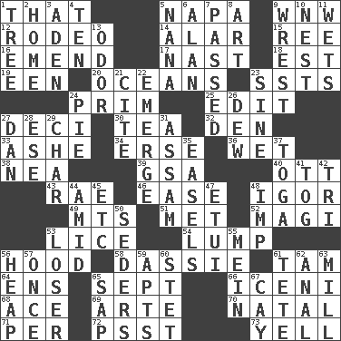 ACROSS 1. Not this but _ 5. California wine valley 9. Compass dir. 12. Cowboy competition 14. Having or resembling wings 15. To separate or throw off 16. Make improvements or corrections to 17. Political cartoonist Thomas 18. Eastern Standard Time (abbr.) 19. Car or cant ending 20. Seas 23. Fast planes 24. Demure 25. Prepare for publication 27. Tenth: prefix 30. Beverage made from leaves 32. Lair 33. American tennis player Robert 34. Celtic language 36. Soggy 38. Teachers' org. 39. Girls' org. (abbr.) 40. Baseball player Mel 43. Actress Charlotte 46. Relaxation 48. Russian composer Stravinsky 49. Mountains (abbr.) 51. Was introduced to 52. Wise men 53. Louse (plural) 54. Mass 56. Parka part 58. Hyrax 61. Scottish cap 64. Followers of ems 65. Back-to-school mo. 66. Ancient Celtic tribe of eastern Britain 68. Adept person 69. Johnson of "Laugh-In" 70. Relating to or accompanying birth 71. For each 72. Inconspicuous attention getter 73. Shout DOWN 1. Relationship diagram 2. Residence 3. Arabian gulf 4. "___ Little Indians" 5. Grandmother 6. Actor Alda or Thicke 7. Went by 8. Tate display 9. Obtain by seizing forcibly or violently 10. Egg locale 11. Moistens 13. Aroma 21. Quote 22. Develop 23. Trig term 24. Sliced dessert 26. Morning condensation 27. One of the 12 tribes of Israel 28. Compass dir. 29. Burn to charcoal 31. Indian state 35. Artist's stands 37. Ancient Roman robe 41. Coat; cloak 42. Three (prefix) 44. Among 45. And so on (abbr.) 47. Needle holder 48. Naughty child 50. Spring feasts 53. Failure 55. Chow _ 56. Pile 57. Single time 59. Flats, for short 60. Proofreading order 61. Wig 62. Of or related to the anus 63. Place where flour is made 65. Plant excrement 67. Island