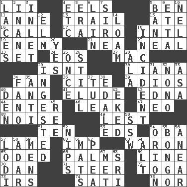 ACROSS 1. Cards in a Roman deck? 4. Snakelike fish 8. Benjamin's nick name 11. Queen of England 1702-14 13. Hang back 15. Had dinner 16. Give a ring to 17. Capital of Egypt 18. International (abbr.) 19. Foe 21. Teachers' org. 22. Anneal 23. Arrange properly for use 24. Greek goddess of the dawn 27. Big _ 29. Is not 30. Climbing, woody, usually tropical vines 34. Avid follower 36. Quote 39. Goodbye (Sp.) 40. Mild oath, euphamism for damn 41. Evade 43. Pulitzer Prize-winning author Ferber 44. Keyboard key 46. Path through which fluid escapes 47. Modern: prefix 48. Annoying sound 49. For fear that 51. Nine, plus one 53. Begley and Asner 54. Chief or king in Benin or Nigeria 57. Unable to walk 60. Mischievous child 63. Make _____ (do battle with) 65. Wrote a lyric poem 66. Insides of hands 69. Actor's bit 70. One of the 12 tribes of Israel 71. Navigate 72. Ancient Roman robe 73. Big collection agency 74. Suttee (variant) 75. And not DOWN 1. Shoestrings 2. Silly 3. An arm off of a larger body of water 4. And so on (abbr.) 5. Epoch 6. (Had) reclined 7. Title for a man of rank and authority 8. Object of repulsion 9. Singer James 10. 1994 drama film starring Jodie Foster 12. Shade tree 14. Rich soil 18. Event 20. Affirmative reply 25. Single time 26. Free of sound 28. According to 29. Consumed 31. Helper 32. Words to Nanette 33. White ___ sheet 34. Papal veil 35. Against 37. Third day of the wk. 38. Peak District village in England 40. Lair 42. Made supply last 45. To separate or throw off 50. Compass dir. 52. Pinches, bites 54. Constellation of myth 55. Beat drum 56. Approach 57. Farming town in central California 58. The sixth month of the Jewish calendar 59. Not women's 61. Floor coverings 62. Entreaty 64. The first octave above the treble staff 67. Was introduced to 68. Indian title of respect (Mr.)