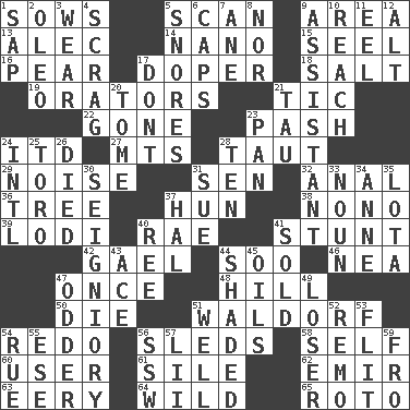 ACROSS 1. Sty mamas 5. Examine minutely or intensely 9. Type of rug 13. Actor Baldwin 14. Billionth: prefix 15. Stitch closed the eyes of (a falcon) 16. Lightbulb-shaped fruit 17. Drug addict 18. Table seasoning 19. Speakers 21. Nervous spasm 22. Went 23. Romantic infatuation 24. It would 27. Mountains (abbr.) 28. Strained 29. Annoying sound 31. Elected rep. 32. Of or related to the anus 36. Family _ (genealogy) 37. Attila the _ 38. Words to Nanette 39. Farming town in central California 40. Actress Charlotte 41. Check the growth or development of 42. Highlander 44. "Barney Miller" actor Jack 46. Teachers' org. 47. Single time 48. Land elevation 50. Expire 51. Apple salad 54. Redecorate 56. Bobsleighs 58. Oneself 60. One who makes use of a thing 61. Drop; flow; fall 62. Independent ruler or chieftain 63. Suggestive of the supernatural 64. Rampant 65. Printing process, for short DOWN 1. Plant excrement 2. Margarine 3. Erode 4. Strangle with an iron collar 5. Sounds asleep 6. Smile enhancers 7. A saturated hydrocarbon 8. Not either 9. Aide 10. Arrive at 11. Snakelike fish 12. The first octave above the treble staff 17. Do not 20. Heavy book 21. The 19th letter of the Greek alphabet 23. Baking dish 24. International (abbr.) 25. "Corrida" creature 26. Passed on 28. Nine, plus one 30. Signiory (variant) 31. Take to court 33. Part of speech 34. Singer Murray 35. Globular water bottle used in Asia 37. Actor Linden 40. Portuguese money of account (variant) 41. Exchanged or delivered for money 43. Adept person 44. Cast a shadow over 45. Lubricates 47. More peculiar 49. Failure 51. Water source 52. San ____ (Riviera town) 53. Secret move to avoid paying debts 54. Sorrow 55. Compass dir. 56. Compass dir. 57. Cards in a Roman deck? 59. From