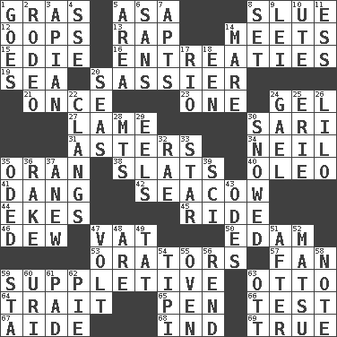 ACROSS 1. Pate de foie ____ 5. White ___ sheet 8. Change direction abruptly 12. I made a mistake 13. Strike 14. Confronts 15. Singer Brickell 16. Pleas 19. Ocean 20. More disrespectful 21. At one time in the past 23. Single 24. Set 27. Unable to walk 30. Indian skirt 31. Michaelmas daisies 34. Famous astronaut Armstrong 35. NW Algerian seaport 38. Narrow boards 40. Margarine 41. Mild oath, euphamism for damn 42. Manatee 44. Supplements with great effort 45. Travel on an animal 46. Morning condensation 47. Large container 50. Dutch treat 53. Speakers 57. Air blower 59. Supplementary 63. "Beetle Bailey" pooch 64. Distinguishing feature 65. Writing instrument 66. Trial 67. Helper 68. Working for oneself (abbr.) 69. Loyal DOWN 1. Travels 2. Cowboy competition 3. Bee-related 4. Compass dir. 5. Length times width 6. Without 7. Tenement units (abbr.) 8. Put into a specified state 9. Luau accessory 10. Shoshoni 11. Double-curved letter 14. Female horse 17. River (Sp.) 18. Car or cant ending 20. Oceans 22. Rings loudly 24. Highlander 25. One of the Great Lakes 26. _ and Stitch 28. Mountains (abbr.) 29. Snakelike fish 30. Overwhelmed 32. Actress Charlotte 33. Play the lead 35. Wrote a lyric poem 36. Immoral or dissolute person 37. Afresh 39. _-fi 43. Lyric poems 47. Electrical Unit 48. "We ___ not amused" (Victoria) 49. Make lace 51. Following 52. Taiwanese island in East China Sea 54. Native american tent (variation) 55. Baking chamber 56. Tear apart 58. Brief written record 59. R.R. building 60. RI univ. 61. Writing tablet 62. Sliced dessert 63. Baseball player Mel