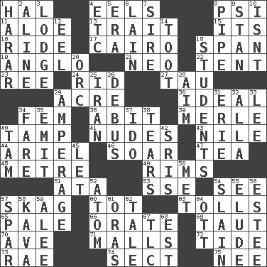 ACROSS 1. Actor Linden 4. Snakelike fish 8. Air pressure measure (abbr.) 11. _ vera 13. Distinguishing feature 15. It is 16. Travel on an animal 17. Capital of Egypt 18. Connect, as a bridge 19. White American of non-Hispanic descent 21. Modern: prefix 22. Portable shelter 23. To riddle 24. To free from 27. The 19th letter of the Greek alphabet 29. Land measure 30. Perfect 34. Opposite of masc. 36. "This won't hurt ____!" 39. Haggard of country music 40. Pack (down) 41. Unclothed pictures 43. "Death on the ____" 44. Satellite of Uranus 46. Fly high 47. Afternoon social gathering 48. Distance measurement (Brit.) 49. Basketball hoops 51. _ moment's notice (2 wds.) 53. Compass dir. 54. Observe 57. Heroin 60. Small child 63. For Whom the Bell _____ 65. Light colored 66. Speak pompously 69. Drawn tight 70. "___ Maria" 71. Promenades 72. Event that recurs at intervals 73. Actress Charlotte 74. Religious group 75. Born DOWN 1. Ethiopian city, capital of Harari 2. Place in a line 3. Inn 4. And so on (abbr.) 5. Epoch 6. (Had) reclined 7. The founder of a family 8. Corncob 9. Comedian Laurel of Laurel & Hardy 10. Is not 12. Snakelike fish 14. A blast of a horn 18. SAT takers 20. The grampus (Milton) 25. SW Asia republic 26. To get out of a bus 28. Direct toward a target or goal 29. Electrical Measurement 31. One of the Great Lakes 32. Silent film actress Nazimova 33. Area sheltered from the wind 34. Conductor's collection 35. Send forth 37. Wedding promise 38. Pulls apart 40. Scottish cap 42. Indian titles of respect 45. Allow 50. Was introduced to 52. Tiny particle 54. Killed 55. Evade 56. First name in cosmetics 57. Practice fight 58. Polynesian shrub of the pepper family 59. Toward shelter 61. Mouths or openings 62. Lie 64. Baseball player Mel 67. Affectionate concern, for short 68. Eastern Standard Time (abbr.)