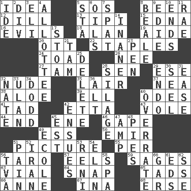 ACROSS 1. The content of cognition 5. Distress signal 8. Fermented drink made from hops 12. Deli pickle 13. Native american tent (variation) 15. Pulitzer Prize-winning author Ferber 16. Vices 18. Actor Alda or Thicke 19. Assistant 20. Baseball player Mel 22. Paper fasteners 24. Frog relative 26. Born 27. Docile 28. Elected rep. 29. Compass dir. 32. Unadorned 35. Den 37. Teachers' org. 38. Medicinal plant 39. Pipe bend 40. Lyric poems 41. Small boy 42. Singer James 43. Short-tailed, large-bodied rat 44. Conclude 45. Compass dir. 46. Yawn 49. Double-curved letter 50. Independent ruler or chieftain 51. Photo 55. For each 56. Edible starchy tuberous root 57. Snakelike fish 59. Gurus 63. Small bottle 64. Fastener 65. Bits 66. Queen of England 1702-14 67. _ tizzy (2 wds.) 68. Celtic language DOWN 1. Binary compound 2. HTML Container Element 3. Biblical high priest 4. One to whom something is allotted 5. R.R. building 6. Lubricates 7. Argument over a trivial matter 8. Memphis, Tenn. Street 9. Singer Brickell 10. Conclusions 11. Actress Charlotte 14. More empty; more void 17. Portico 21. Scottish cap 23. Fenced enclosure 25. Keyboard key 28. Fodder prepared in a silo 29. Inside; within (prefix) 30. Sew up the eyelids of hawks and falcons 31. Relaxation 32. Nathan's nickname 33. Uhlan (variant) 34. Texas town _ City 36. The first octave above the treble staff 40. Make much ado about nothing 42. Follows as a consequence or result 45. Eastern Standard Time (abbr.) 47. Electrical Unit 48. Sliced desserts 49. Learning spot: Fr. 51. Ache 52. SW Asia republic 53. Painter Guido (1575-1642) 54. Liveliness 56. Federal power corp. 58. Health resort 60. Slender fish 61. Begley and Asner 62. Compass dir.