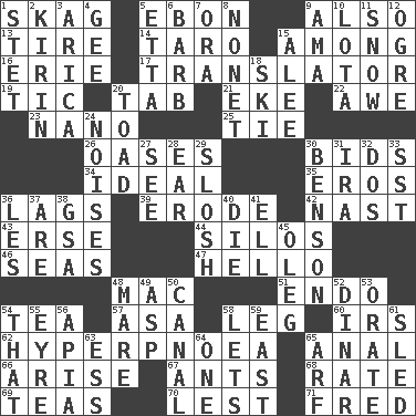 ACROSS 1. Heroin 5. Inky black, to poets 9. In addition 13. Hoop that covers a wheel 14. Edible starchy tuberous root 15. Amid 16. One of the Great Lakes 17. Interpreter 19. Nervous spasm 20. Bar bill 21. Supplement with great effort 22. Deep reverence 23. Billionth: prefix 25. Make a knot 26. Fertile tracts in a desert 30. Auction offers 34. Standard of perfection 35. Greek god of love 36. Falls behind 39. Eat (away) 42. Political cartoonist Thomas 43. Celtic language 44. Grain storage towers 46. Oceans 47. Phone greeting 48. Apple computer (short form) 51. Inside; within (prefix) 54. Afternoon social gathering 57. White ___ sheet 58. Part of a journey 60. Big collection agency 62. Abnormally rapid or deep breathing 65. Of or related to the anus 66. Get up 67. Pismires 68. Pace 69. Beverages made from leaves 70. For fear that 71. Flintstone DOWN 1. Proofreading order 2. Japanese brewing company 3. N. Chile seaport 4. Unit of force equal to gravity 5. Singer James 6. Sharp remark 7. Mouth or opening 8. Music written for nine 9. Nanny (var.) 10. Globular water bottle used in Asia 11. Overwhelm 12. Legendary monster 15. Toward shelter 18. What Jean-Claude Killy likes to do 20. Frog relative 24. Annoying sounds 27. Perceive with the eye 28. Hearing organ 29. Splash clumsily 30. Gillaume's butler role 31. Lyricist Gershwin 32. Two (Sp.) 33. Fast jet (abbr.) 36. French article 37. "We ___ not amused" (Victoria) 38. Girls' org. (abbr.) 40. Pass on 41. Pipe bend 45. Cassini of fashion 48. Female horse 49. Viper 50. Lessep's creation 52. Middle Eastern gold or silver currency 53. Speak pompously 54. Not this but _ 55. Jane of fiction 56. Capital of Western Samoa 58. Allows 59. 90 degrees 61. Downhill vehicle 63. Curvy letter 64. Single 65. Sandy's bark