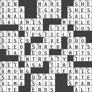 ACROSS 1. Benjamin's nick name 4. Female horse 8. A female animal or person 11. The main thing one is thinking about 13. Mild oath 14. "______ My Girl" (Turtles hit) 15. Of or related to the anus 16. Perceives with the eye 17. Table seasoning 18. Deli grouping 21. Haggard of country music 22. Libertine 23. Falsehood 25. Two (Sp.) 26. Retirement account (abbr.) 29. One of the two male reproductive glands 32. Flat circles 34. Night before a holiday 35. Superhero pair 38. Butter sub 39. Tear up 41. Pismires 43. Consume 44. Greek goddess of the dawn 45. Sends forth 46. Plea 50. Small child 51. Remaining after all deductions 54. White ___ sheet 55. Hoop that covers a wheel 57. Amid 59. Pertaining to the sea 63. Male parent of an animal 64. Hereditary estate 67. Assign a rank or rating to 68. _ mater 69. Travel by water 70. Connect, as a bridge 71. Potassium hydroxide 72. Conclusions 73. Keyboard modifier key DOWN 1. Prejudice 2. Pulitzer Prize-winning author Ferber 3. Anneal 4. Makes clutter 5. Ripen 6. Actress Charlotte 7. Begley and Asner 8. Broken piece 9. Phone greeting 10. _____ Park, CO 12. Having or resembling wings 14. Compass dir. 19. Floor coverings 20. Mamie's mate 21. Cartoonist voice _ Blanc 23. Moving, as bait 24. On the rocks 26. Wedding promise 27. Cause heat under the collar 28. At sea 30. Laconic 31. Dutch treat 33. ____ d'Azur (French Riviera) 36. A single undivided whole 37. "Beetle Bailey" pooch 39. Puts into a specified state 40. Israeli folk dance 42. Fast jet (abbr.) 45. Jane of fiction 47. Tired old horse 48. Ringlike coral islands and reefs 49. Nervous spasm 51. Relating to the nose 52. Poet Dickinson 53. Singer Mel 56. Hearing organs 58. Teachers' org. 60. California wine valley 61. Slanted text style (abbr.) 62. Penny 64. Purpose 65. One of the 12 tribes of Israel 66. Help