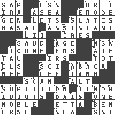 ACROSS 1. Plant excrement 4. Double-curved letter 7. Cy Young winner Saberhagen 11. Lyricist Gershwin 12. Toward the sea 13. Wear away 14. Commissioned mil. rank 15. Allows 16. Chalkboards 17. Relating to the nose 19. Helper 21. Cards in a Roman deck? 23. Angers 24. Saudi Arabian king (1953-1964) 25. Grow older 26. Compass dir. 29. Singer Mel 30. Followers of ems 31. Had dinner 32. The 19th letter of the Greek alphabet 33. Big collection agency 34. Small child 35. Raised railways 36. _-fi 37. Phillipine bananalike plant 40. Born 41. Area sheltered from the wind 42. Hyperbolic tangent 43. Glance over 45. The first octave above the treble staff 46. Conclusion 51. The easternmost of the Lesser Sundas 55. Foolish or stupid persons 56. Raised platform 58. Single 59. Having high moral qualities 60. Singer James 61. Benjamin's nick name 62. Celtic language 63. Ocean 64. Fast jet (abbr.) DOWN 1. Signal 2. Length times width 3. Baking dishes 4. Compass dir. 5. Bristle 6. Backtalk 7. Naughty children 8. Round or rotation of duties 9. Paradise 10. Trial 12. Plant genus of onion and garlic 13. Otherwise 16. Fathers 18. Having or resembling wings 20. Omens 22. Binary compound 24. Lush 25. Nest on high 26. Timepiece 27. Portico 28. Soggy 29. Story 32. "___ Little Indians" 33. Ancient Celtic tribe of eastern Britain 36. Narrow boards 37. _ moment's notice (2 wds.) 38. Greek mezzo-soprano Agnes 39. Opposed to 43. Took without asking 44. Quote 46. Trig term 47. Scent 48. Chest bones 49. Lyric poems 50. Nathan's nickname 52. Disorderly crowds 53. Singles 54. Monthly bill 57. Call ___ day
