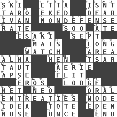 ACROSS 1. What Jean-Claude Killy likes to do 4. Singer James 8. Is not 12. Edible starchy tuberous root 14. Supplemented with great effort 15. Letter starter 16. _ the terrible 17. Unrelated to defense, as in spending 20. Pace 21. "Barney Miller" actor Jack 22. Had dinner 23. 1973 Nobel Price Winner (Physics) Leo 27. Back-to-school mo. 29. Floor protectors 31. Protracted 34. Timepiece 35. Length times width 36. _ mater 39. Layer 41. Russian ruler of old 42. Strained 43. Nest on high 46. Domed church section 47. Secret move to avoid paying debts 48. Greek god of love 51. Cabin 54. Was introduced to 56. Modern: prefix 58. Relating to the mouth 61. Pleas 66. Thickened enlargement 67. It may be bright or harebrained 68. Haul 69. Locale of original sin 70. Characteristic smell of wine 71. At one time in the past 72. Conclusion DOWN 1. Disorderly outburst 2. Polynesian shrub of the pepper family 3. Feeling or showing extreme anger 4. Car or cant ending 5. Ring climax 6. "___ Little Indians" 7. Does sums 8. Binary compound 9. Legislators 10. Political cartoonist Thomas 11. Family _ (genealogy) 13. Washington bills 18. Greek goddess of the dawn 19. Enemy 24. Nanny (var.) 25. Krazy ___ of comics 26. Hankering 28. Food holder 30. Bundle of cut stalks of grain 32. Teachers' org. 33. Slender fish 34. Wetness 36. "One Day ___ Time" 37. Infant locale 38. French bagpipes 40. 1994 drama film starring Jodie Foster 44. _ de Janeiro 45. It would 49. Single 50. Ocean 52. Went 53. Eat (away) 54. Count _ (2 wds.) 55. Inside; within (prefix) 57. Von Bismarck 59. An important port of Yemen 60. Grant temporary use of 62. Actress Charlotte 63. Electrically charged atom 64. And so on (abbr.) 65. Observe