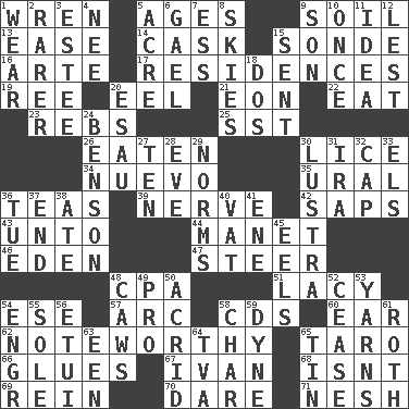 ACROSS 1. Songbird 5. Eras 9. The visible part of the earth's surface 13. Relaxation 14. Keg 15. Something which is sent 16. Johnson of "Laugh-In" 17. Dwellings 19. To riddle 20. Snakelike fish 21. Period of immesurable duration 22. Consume 23. Confederate soldiers (slang) 25. Fast jet (abbr.) 26. Ingested 30. Louse (plural) 34. New (sp.) 35. Mountain range 36. Afternoon social gatherings 39. Impudent aggressiveness 42. Plant excrements 43. To (old English) 44. French painter Edouard 46. Genesis locale 47. Navigate 48. Numbers guy (abbr.) 51. Made of lace 54. Compass dir. 57. Curve 58. Music discs 60. Hearing organ 62. Music shop? 65. Pacific island yam 66. Cements 67. "Terrible" tsar 68. Is not 69. It's straight from the horse's mouth 70. Have the gumption 71. Soft DOWN 1. Put on (as clothing) 2. More valued for its uncommonness 3. First name in cosmetics 4. Born 5. 43,560 square feet 6. Highlander 7. Curvy letter 8. Atmospheres 9. Boy, to dad 10. Single time 11. The content of cognition 12. For fear that 15. Posted 18. Two (Sp.) 20. Son of Isaac 24. Gillaume's butler role 27. "___ Little Indians" 28. First lady 29. Typical models 30. A period of five years 31. Lyricist Gershwin 32. Head covering 33. Raised railways 36. Third day of the wk. 37. Conclusion 38. Had dinner 40. Large container 41. Compass dir. 45. Snakelike fish 48. Crow sounds 49. Adept person 50. Sour-tasting 52. Stop 53. Tall tales 54. Engineer (abbr.) 55. Not divided or shared with others 56. Needle holder 58. Burn to charcoal 59. Unit of force 61. Writer of Portnoy's Complaint (1969) 63. Car or cant ending 64. Federal power corp. 65. Metal container