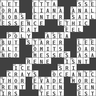 ACROSS 1. Allow 4. Singer James 8. Compass dir. 11. Mouth or opening 12. Climbing, woody, usually tropical vines 14. Of or related to the anus 15. Moves up and down 17. Keyboard key 18. Travel by water 19. Core 21. Moral principle 23. Ingest 24. Snakelike fish 25. More than one (prefix) 27. At sea 30. With the exception that 31. A viewer who gazes fixedly 34. Area sheltered from the wind 37. The first octave above the treble staff 38. Leaves out 39. Rowing implement 40. Modern: prefix 41. Makes clutter 43. White ___ sheet 44. French philosopher Descartes 45. Is not 47. Frozen water 49. _ Lanka 50. Trading vessels 52. Pertaining to the sea 56. Son of Odin 57. Dodge 60. Greater amount 61. Monthly bill 62. Eroded 63. Elected rep. 64. Big collection agency 65. Trial 66. Eastern Standard Time (abbr.) DOWN 1. Ear part 2. Greek god of love 3. Bar bills 4. Choose 5. Prong on a fork 6. Make lace 7. One (Scot) 8. Slow-paced one 9. Ketch in the Levant 10. Pipe bend 13. "We ___ not amused" (Victoria) 14. American tennis player Robert 16. Sew up the eyelids of hawks and falcons 20. Negative votes 22. Beverage made from leaves 25. Whimper 26. "Beetle Bailey" pooch 27. Ascend 28. Arranges properly for use 29. Celtic language 30. Prohibit 32. Heavy book 33. So be it 34. Grant temporary use of 35. Compass direction 36. Epoch 42. The founder of a family 44. Marina Del _, California 46. Thailand, formerly 47. Removes the wrinkles 48. Haul 49. Odor 50. "Mermaids" star 51. Observe 52. Lyric poems 53. Characteristic smell of wine 54. Angers 55. Penny 56. Three (prefix) 58. Large container 59. Had dinner