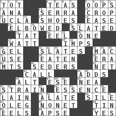 ACROSS 1. Small child 4. Beverages made from leaves 8. I made a mistake 12. Santa ___, CA 13. Spanish missionary in California 14. Riding implement 15. Southern CA. univ. 17. Imelda's hoard 18. Comfort 19. Turned at an angle; bent 21. Scheduled 23. Make lace 24. Snakelike fish 26. Single 27. Electrical Unit 28. Naughty children 30. Set 31. Chalkboards 34. Apple computer (short form) 37. Purpose 38. Consumed 39. Epoch 40. Mountains (abbr.) 41. Spring feasts 42. Remaining after all deductions 43. Give a ring to 44. Does sums 46. Keyboard modifier key 47. Compass dir. 50. Teachers' org. 51. Put through a sieve 54. Gist 57. (Had) reclined 58. Having winglike extensions 60. Filth; sediment 62. Cassini of fashion 63. Music written for nine 64. Shallow baking pan 65. Snakelike fish 66. Domed church section 67. Affirmative reply DOWN 1. The 19th letter of the Greek alphabet 2. At one time in the past 3. Baron Munchausen's specialties 4. Giggle 5. Wear away 6. "We ___ not amused" (Victoria) 7. Backtalk 8. Seas 9. Speak pompously 10. Airs 11. Moved rapidly 13. Compass dir. 16. Blind as ____ 20. Baseball player Mel 22. Chops off 25. 61 cubic inches 27. 270 degrees 29. Not women's 30. Chewing product 31. Sew up the eyelids of hawks and falcons 32. Dipping utensil 33. Had dinner 34. Ananias' fault 35. Ancient Greek god of war 36. Feline 41. Suttee (variant) 43. Gives out a loud, resonant sound 44. A saturated hydrocarbon 45. Hiding places for outlaws 46. Satellite of Uranus 48. Actors Connery and Penn 49. First name in cosmetics 51. A type of plum 52. Lie 53. Grandmother 55. Arrange properly for use 56. Writer Wiesel 59. Chop off 61. Followers of ems