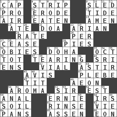 ACROSS 1. Head covering 4. Remove all contents or possession from 9. Downhill vehicle 13. Adept person 14. Wear away 15. Event that recurs at intervals 16. Atmosphere 17. Ingested 18. So be it 19. Had dinner 21. ___ good deed 22. Believer in; advocate of (suffix) 24. Pace 26. For each 27. Desist 29. Sliced desserts 30. Off-Broadway awards 31. Capital of the state of Qatar 33. Sep. follower 36. Small child 37. Pulling into pieces 40. Indian title of respect (Mr.) 41. Followers of ems 42. Small bottle 43. Being in motion 45. Deliberation 47. First-year military academy student 48. Teat (slang) 49. Period of immesurable duration 50. Odor 52. Title for a knight 54. Eastern Standard Time (abbr.) 56. Of or related to the anus 57. Bert's buddy 59. Big collection agency 61. Earth 62. Remove soap 63. Compete 64. Zero-star reviews 65. NE Netherlands city 66. A really long time DOWN 1. Accounting whiz (abbr.) 2. Roberta Peters solo 3. Likenesses of persons 4. Observe 5. Barter 6. Printing process, for short 7. The main thing one is thinking about 8. Writing instrument 9. Flight of steps 10. Pale green bean 11. Paradise 12. Lair 20. Relaxation 22. Bee-related 23. To riddle 25. Trial 27. ____ d'Azur (French Riviera) 28. Inky black, to poets 29. Silvers or Donahue 31. Raised platform 32. Mouth or opening 33. Clearly or manifestly demonstrative 34. Baby bed with high sides 35. Become fatigued 38. Webber/Rice musical 39. Yawn 44. _ gin 45. Ringlike coral islands and reefs 46. Zeal 49. Originate 50. Small Philippine buffalo 51. Precipitation 52. Indian titles of respect 53. Restaurants 55. Musical group of three 56. Viper 57. Epoch 58. Car or cant ending 60. Elected rep.