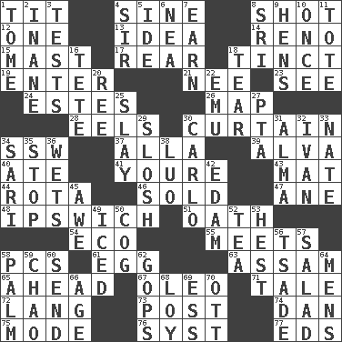 ACROSS 1. Teat (slang) 4. Trig term 8. Guess 12. Single 13. The content of cognition 14. Western Nevada city 15. Vertical spar for supporting sails 17. Bring up, as a child 18. Colored lightly or faintly 19. Keyboard key 21. Born 23. Observe 24. _____ Park, CO 26. Atlas unit 28. Snakelike fish 30. Window treatment 34. Compass dir. 37. Silent film actress Nazimova 39. Inventor's middle name 40. Had dinner 41. You are 43. Floor covering 44. Round or rotation of duties 46. Disposed of to a purchaser 47. A saturated hydrocarbon 48. NE Massachusetts town 51. Pledge 54. Environmental prefix 55. Confronts 58. Personal Computers (abbr.) 61. Ovum 63. Indian state 65. Having the leading position 67. Butter sub 71. Story 72. Austrian-born American filmmaker Fritz 73. Mail 74. One of the 12 tribes of Israel 75. Method 76. System (abbr.) 77. Begley and Asner DOWN 1. Heavy book 2. Empty; void 3. Trials 4. Title for a knight 5. Binary compound 6. Teachers' org. 7. Merit 8. _ Lanka 9. Coop moms 10. At one time in the past 11. Haul 16. Wig 18. Pull into pieces 20. To riddle 22. Australian flightless bird 25. Kill 27. Parent Teacher Assoc. 29. Agitate, as a liquid 30. Monte _, Las Vegas Hotel/Casino 31. _ mater 32. _ the terrible 33. Nathan's nickname 34. Indian skirt 35. Halt 36. Soaks 38. Nilotic language 42. Dutch treat 45. Deep reverence 49. On the rocks 50. Gear tooth 52. Afternoon social gathering 53. Behest 56. Sadhe (variant) 57. First course 58. Inside of hand 59. US Secretary of Labor Elaine L. _ 60. Transmit 62. Republicans 64. Not women's 66. Personal question 68. Myrna of the movies 69. Curvy letter 70. Baseball player Mel