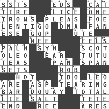 ACROSS 1. Fast planes 5. Begley and Asner 8. Domesticated feline 11. Become fatigued 12. Louse (plural) 14. Single 15. Removes the wrinkles 17. Entreaties 18. Enemy 19. Small, flat, pigmented spot on the skin 21. Heredity factor (abbr.) 22. Avid follower 23. Compass dir. 24. Grand Old Party 25. Shoshoni 27. Born 28. Snakelike fish 31. Inside of hand 35. Symbol (abbr.) 37. Native of Scotland 38. Margarine 39. Ewer handle 41. Ballerina skirt 42. Beverages made from leaves 43. Baking dish 45. Connect, as a bridge 46. Arranges properly for use 47. Director Reiner 49. Being at a high temperature 51. Wedding promise 52. Lion 55. "We ___ not amused" (Victoria) 57. Cleo's killer 60. Pulling apart 62. Soap unit 63. A city in N France, SE of Calais 65. Add up to 66. Whopper 67. Table seasoning 68. Wig 69. Conclude 70. Portuguese money of account (variant) 71. Ancient Greek god of war DOWN 1. Vertical member of a panel or frame 2. Fathers 3. Heavy duty weighing machine 4. Emitted 5. Pipe bend 6. Passed on 7. Skim 8. Java holder (2 wds.) 9. Small Philippine buffalo 10. Adolescent 13. Son of Isaac 16. Attach a signature 17. Wimpy's pal 20. Travels 26. Trials 29. Globular water bottle used in Asia 30. Surprise greatly 31. Cooking vessels 32. Toward shelter 33. Tough but pliablecoriaceous 34. With motion or animation 36. Atlas unit 40. Noteworthy scarcity 44. Connecting point 48. Water vessel 50. Small boys 52. 61 cubic inches 53. Related on the mother's side 54. Stares 55. Competent 56. Precipitation 58. Fly high 59. Whine 61. Round or rotation of duties 64. Had dinner
