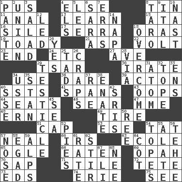 ACROSS 1. Product of festering 4. Otherwise 8. Metal container 11. Of or related to the anus 13. Memorize 15. "One Day ___ Time" 16. Drop; flow; fall 17. Spanish missionary in California 18. Mouths or openings 19. Sycophant 21. Viper 22. Electrical Unit 23. Conclude 24. And so on (abbr.) 27. "___ Maria" 29. Russian ruler of old 30. Feeling or showing extreme anger 34. Purpose 36. Have the gumption 39. NE Massachussets city 40. Fast planes 41. Connects, as a bridge 43. I made a mistake 44. Theater features 46. Wither 47. Madame (abbr.) 48. Bert's buddy 49. Hoop that covers a wheel 51. Head covering 53. Compass dir. 54. Make lace 57. Be tempered by heat 60. Big collection agency 63. Learning spot: Fr. 65. Stare at amorously 66. Ingested 69. Brightly colored fish 70. Plant excrement 71. Vertical member of a panel or frame 72. Wig 73. Begley and Asner 74. One of the Great Lakes 75. Observe DOWN 1. Thick mixture 2. The state of being joined or united 3. Vegetable dish 4. Raised railways 5. Area sheltered from the wind 6. "Two Mules for Sister ____" 7. Blunders 8. Pacific island yam 9. Slanted text style (abbr.) 10. Political cartoonist Thomas 12. Directed 14. California wine valley 18. Conquer 20. It is so 25. Small boys 26. Dice game 28. By way of 29. One of the two male reproductive glands 31. Smallest unit of an element 32. Drink excessively 33. Followers of ems 34. One who uses or employs something 35. Comedian Laurel of Laurel & Hardy 37. Actress Charlotte 38. Maternal 40. Compass dir. 42. Indian titles of respect 45. Ocean 50. Portuguese money of account (variant) 52. Sliced desserts 54. Drinks excessively 55. Having winglike extensions 56. Giggle 57. Olfactory organ 58. Mild oath 59. High mountains 61. Pace 62. Agitate 64. Small bed 67. Connecticut Ivy Leaguer 68. Born