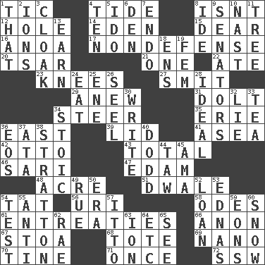 ACROSS 1. Nervous spasm 4. Periodic rise and fall of the sea level 8. Is not 12. Opening into or through something 14. Genesis locale 15. Letter starter 16. Small Philippine buffalo 17. Unrelated to defense, as in spending 20. Russian ruler of old 21. Single 22. Had dinner 23. Leg joints 27. Stricken, poetically 29. Afresh 31. Dunce 34. Bull 35. 4th largest of the Great Lakes 36. Compass direction 39. Flaplike covering 41. Toward the sea 42. "Beetle Bailey" pooch 43. "_____ Recall" 46. Indian skirt 47. Dutch treat 48. 1/640 square mile 51. A sleeping potion; an opiate (poet.) 54. Make lace 56. RI univ. 58. Lyric poems 61. Pleas 66. At once, immediately (arch.) 67. Portico 68. Carry 69. Billionth: prefix 70. Prong on a fork 71. At one time in the past 72. Compass dir. DOWN 1. Not this but _ 2. Charged particles 3. Loose outer garment 4. Nine, plus one 5. Wedding promise 6. Lair 7. Inside; within (prefix) 8. Binary compound 9. Legislators 10. Political cartoonist Thomas 11. Family _ (genealogy) 13. Merit 18. Followers of ems 19. Opposite of masc. 24. Erode 25. Compass dir. 26. Sew up the eyelids of hawks and falcons 28. Standard of perfection 30. Compose 32. Untruth 33. Beverage made from leaves 34. Unemotional 36. Greek goddess of the dawn 37. "One Day ___ Time" 38. Ski resort town in Vermont 40. Texas town _ City 44. The 23rd letter of the Hebrew alphabet 45. Nursemaid (var.) 49. Regret 50. Epoch 52. Grant temporary use of 53. Ferber et al. 54. Trial 55. Opposed to 57. "Tell ____ the Marines!" 59. Immeasurably long periods of time 60. Overwhelm 62. Actress Charlotte 63. Electrically charged atom 64. And so on (abbr.) 65. Perceive with the eye
