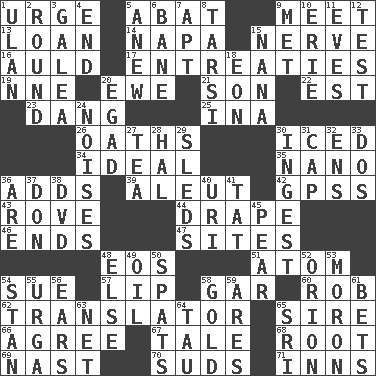 ACROSS 1. Goad 5. Blind as ____ 9. Rendezvous 13. Grant temporary use of 14. California wine valley 15. Boldness 16. Old (Scot.) 17. Pleas 19. Compass dir. 20. She-sheep 21. Male offspring 22. Eastern Standard Time (abbr.) 23. Mild oath, euphamism for damn 25. _ tizzy (2 wds.) 26. Profane or obscene expressions 30. On the rocks 34. Perfect 35. Billionth: prefix 36. Does sums 39. Native American of Southwest Alaska 42. Global Positioning Systems (abbr.) 43. Be footloose 44. Window treatment 46. Conclusions 47. Locates 48. Greek goddess of the dawn 51. Tiny particle 54. Take to court 57. Mouth edge 58. Slender fish 60. Director Reiner 62. Interpreter 65. Father 66. Match 67. Story 68. Carrot, for example 69. Political cartoonist Thomas 70. Soap bubbles 71. Lodging establishments DOWN 1. Uhlan (variant) 2. Single shot of ammunition 3. An organ shaped like a helmet 4. Conclusion 5. Afresh 6. Object of repulsion 7. Fitting 8. Tarsus (plural) 9. Was introduced to 10. One of the Great Lakes 11. Nights before holidays 12. Trial 15. Grandmother 18. A really long time 20. Mild oath 24. Annoying sounds 27. Beverage made from leaves 28. Actor Linden 29. Bobsleighs 30. Consume 31. Head covering 32. Followers of ems 33. Two (Sp.) 36. "We ___ not amused" (Victoria) 37. Spanish title 38. Movie disc 40. RI univ. 41. Make lace 45. Lightbulb-shaped fruit 48. Otherwise 49. Petroleum 50. Arguments over trivial matters 52. Greek mythologigal hunter 53. Person of subnormal intelligence 54. Comedian Laurel of Laurel & Hardy 55. Capital and largest city of Mongolia 56. Hearing organs 58. Gilded 59. Ancient Greek god of war 61. Stakes 63. Remaining after all deductions 64. The 19th letter of the Greek alphabet 65. _ Lanka