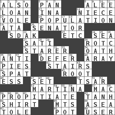 ACROSS 1. In addition 5. Baking dish 8. Toward shelter 12. Grant temporary use of 13. _ tizzy (2 wds.) 14. Sibling's daughter 15. Short-tailed, large-bodied rat 16. Census information 19. "One Day ___ Time" 20. Legislator 21. Neighbor of Neb. 23. And so on (abbr.) 24. Ocean 27. Suttee (variant) 30. College mil. group 31. A viewer who gazes fixedly 34. Pledge 35. Opposed to 38. Put off 40. Like ___ of sunshine 41. Sliced desserts 42. Flight of steps 44. Petty quarrel 45. Carrot, for example 46. Curvy letter 47. Arrange properly for use 50. Russian ruler of old 53. Chrissie's court nemesis 57. Big _ 59. Conciliate 63. Hyperbolic tangent 64. Upper-body garment 65. Mountains (abbr.) 66. Toward the sea 67. Lacquered or enameled metalware 68. Plant holder 69. One who uses or employs something DOWN 1. Inventor's middle name 2. Plunders 3. Vegetable dish 4. Single 5. Corncob 6. At once, immediately (arch.) 7. California wine valley 8. Small island 9. Flowery wreath 10. Environmental prefix 11. Car or cant ending 14. Drug cop 17. Shoshoni 18. Car dealer's back yard 20. Three-handed card game 22. Aid 24. Fly high 25. Singer James 26. Painful 28. Bit 29. Angers 30. Ridicules or criticizes harshly 32. Newt 33. Hitchcock's "____ Window" 35. Domed church section 36. Cuts off 37. Beverages made from leaves 39. River (Sp.) 43. Round or rotation of duties 47. Stricken, poetically 48. Ingest 49. Three (prefix) 51. Collect or gather 52. Indian princess (variant) 54. Pack (down) 55. "Tell ____ the Marines!" 56. Egg locale 58. Burn to charcoal 59. Pacific Standard Time (abbr.) 60. 17th letter of the Greek alphabet 61. Lubricate 62. Before (prefix) 63. The 19th letter of the Greek alphabet