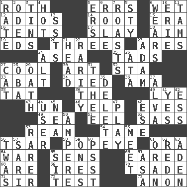 ACROSS 1. Writer of Portnoy's Complaint (1969) 5. Blunders 9. Dripping 12. Goodbye (Sp.) 14. Carrot, for example 15. Epoch 16. Portable shelters 17. Kill 18. Direct toward a target or goal 19. Begley and Asner 20. Triads 23. Ancient Greek god of war 24. Toward the sea 25. Bits 27. Calm and collected 30. Nonscientific branch of learning 32. R.R. building 33. Blind as ____ 34. Passed on 36. Wet nurse (var.) 38. Make lace 39. Definite Article 40. Sodium hydroxide 43. Attila the _ 46. Sharp bark 48. Nights before holidays 49. Ocean 51. Snakelike fish 52. Backtalk 53. 480, 500 or 516 sheets of paper 54. Not wild 56. Russian ruler of old 58. Wimpy's pal 61. Mouth or opening 64. Armed conflict 65. Elected reps. 66. Having ears or earlike features 68. "We ___ not amused" (Victoria) 69. Angers 70. Sadhe (variant) 71. Title for a knight 72. Trial 73. At once, immediately (arch.) DOWN 1. Pace 2. Wrote a lyric poem 3. Airtight sealed metal containers 4. Being at a high temperature 5. Celtic language 6. Hero or heavy, e.g. 7. Exposes to great heat 8. Filthy place 9. Puts on (as clothing) 10. One of the Great Lakes 11. Scottish caps 13. Fast planes 21. Froth on beer 22. Noteworthy scarcity 23. First man 24. Keyboard modifier key 26. "One Day ___ Time" 27. Feline 28. Chief or king in Benin or Nigeria 29. Pledge 31. Giggle 35. Keyboard key 37. Inventor's middle name 41. It is so 42. Double-curved letter 44. One who makes use of a thing 45. Teachers' org. 47. Live dramatic performance 48. Compass dir. 50. Electrical Unit 53. More uncommon 55. Confront 56. It was, poetically 57. Indian skirt 59. Singles 60. Inconspicuous attention getter 61. Northwest Algerian city 62. Make new 63. Arabian gulf 65. Be seated 67. White ___ sheet