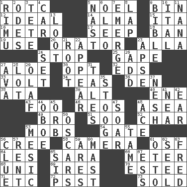 ACROSS 1. College mil. group 5. Christmas carol 9. Storage container 12. Perfect 14. _ mater 15. Call ___ day 16. Paris' subway 17. Ooze 18. Bar 19. Purpose 20. Speaker 23. Silent film actress Nazimova 24. Halt 25. Open wide 27. Medicinal plant 30. Elect 32. Begley and Asner 33. Electrical Unit 34. Beverages made from leaves 36. Lair 38. "One Day ___ Time" 39. The first octave above the treble staff 40. Compass dir. 43. Egg _ yung 46. Vintage cars 48. At sea 49. Sis' sibling 51. "Barney Miller" actor Jack 52. Burn to charcoal 53. Disorderly crowds 54. Yard entry 56. Algonquian 58. Device for capturing images 61. Order of Saint Francis (abbr.) 64. French article 65. "Two Mules for Sister ____" 66. Distance measurement 68. University (slang) 69. Angers 70. First name in cosmetics 71. And so on (abbr.) 72. Inconspicuous attention getter 73. Disposed of to a purchaser DOWN 1. Tall New Zealand timber tree 2. Lyric poems 3. False hair 4. 4-wheeled motor vehicle 5. Political cartoonist Thomas 6. Butter sub 7. Develop 8. Pet locale 9. The Good Book 10. Slanted text style (abbr.) 11. Nanny 13. Spoils 21. Carrot, for example 22. Seem 23. Domed church section 24. Put into a specified state 26. Say or write further 27. Actress Gardner 28. Car dealer's back yard 29. Norwegian king 31. Stories 35. Moe Howard, for one 37. Soft 41. Teachers' org. 42. Hearing organ 44. Mitch Miller's instrument 45. Globe 47. Fly high 48. Adept person 50. Motion picture awards 53. Mesonic 55. Not wild 56. A slight indication 57. Monthly bill 59. Ancient Greek god of war 60. Vertical spar for supporting sails 61. Von Bismarck 62. Sew up the eyelids of hawks and falcons 63. Flintstone 65. Small drink 67. Curvy letter