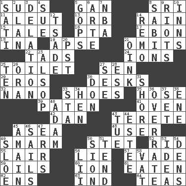 ACROSS 1. Soap bubbles 5. Separate the seeds from cotton 8. _ Lanka 11. Native American of Southwest Alaska 13. Globe 14. Water falling in drops from the sky 15. Stories 16. Parent Teacher Association (abbr.) 17. Inky black, to poets 18. _ tizzy (2 wds.) 19. Domed church section 21. Leaves out 22. Small boys 24. Charged particles 25. Bathroom 27. Elected rep. 29. Greek god of love 30. Writing tables 32. Billionth: prefix 33. Imelda's hoard 35. Stockings 39. Eucharist need 41. Baking chamber 42. Daniel's nick name 43. Cylindrical with tapered ends 45. Toward the sea 48. One who uses or employs something 49. Excessive but superficial compliments 50. Proofreading order 52. To free from 55. Den 56. Untruth 57. Dodge 59. Petroleums 60. Electrically charged atom 61. Eroded 62. Followers of ems 63. Indiana (abbr.) 64. Afternoon social gatherings DOWN 1. Suttee (variant) 2. ____ Bator, Mongolia 3. Accusation by an informer 4. Take to court 5. Republicans 6. Johnson of "Laugh-In" 7. Basketball assoc. 8. Unit of acoustic absorption 9. Disturbances 10. Lodging establishments 12. Sadhe (variant) 14. San ____ (Riviera town) 20. Pacific Standard Time (abbr.) 21. Pig sound 23. Columnist Joseph or Stewart 25. "___ Little Indians" 26. Mouth or opening 27. Observe 28. Curvy letter 30. Spanish title 31. Dinah or Pauly 33. R.R. building 34. Layer 36. Make much ado about nothing 37. Put into a specified state 38. Compass dir. 40. First man 43. Third day of the wk. 44. First name in cosmetics 45. At full speed 46. Moves on water 47. Blunders 49. _ gin 50. The Jewish people; Israel 51. Be inclined (to) 53. The content of cognition 54. Hiding places for outlaws 56. Cards in a Roman deck? 58. Large container
