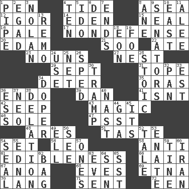 ACROSS 1. Fenced enclosure 4. Periodic rise and fall of the sea level 8. Toward the sea 12. Russian composer Stravinsky 14. Paradise 15. Actress Patricia 16. Light colored 17. Unrelated to defense, as in spending 20. Dutch treat 21. "Barney Miller" actor Jack 22. Had dinner 23. Parts of speech 27. Egg locale 29. Back-to-school mo. 31. Drink excessively 34. Prevent from occurring 35. Mouths or openings 36. Inside; within (prefix) 39. Daniel's nick name 41. Is not 42. Ooze 43. Mysterious quality of enchantment 46. Not divided or shared with others 47. Inconspicuous attention getter 48. Ancient Greek god of war 51. Clothes sense 54. Arrange properly for use 56. Lion 58. Against 61. The property of being fit to eat 66. Den 67. Small Philippine buffalo 68. Nights before holidays 69. Inactive volcano in Sicily 70. Austrian-born American filmmaker Fritz 71. Posted 72. Car or cant ending DOWN 1. Corncob 2. Mild oath 3. Pitcher Ryan 4. "___ Little Indians" 5. Wedding promise 6. Lair 7. Conclusions 8. One (Scot) 9. Elected representatives 10. Compass direction 11. Toward shelter 13. San ____ (Riviera town) 18. Period of immesurable duration 19. Enemy 24. Purpose 25. Remaining after all deductions 26. Moved rapidly 28. Unemotional 30. _____ steamer (cargo ship) 32. Baking dish 33. Eastern Standard Time (abbr.) 34. Drug addict 36. Curvy letter 37. Modern: prefix 38. Conveyance 40. Political cartoonist Thomas 44. Girls' org. (abbr.) 45. It is 49. Pipe bend 50. Perceive with the eye 52. Falsehood 53. Maternal 54. Lick closed 55. Pulitzer Prize-winning author Ferber 57. Singles 59. Prong on a fork 60. SW Asia republic 62. Paper or plastic container 63. First lady 64. Elected rep. 65. Fast jet (abbr.)