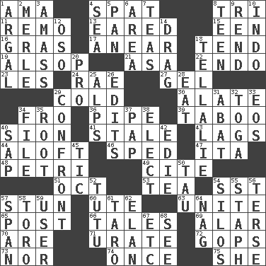 ACROSS 1. Wet nurse (var.) 4. Argument over a trivial matter 8. Three (prefix) 11. San ____ (Riviera town) 13. Having ears or earlike features 15. Car or cant ending 16. Pate de foie ____ 17. Approach 18. Be inclined (to) 19. Columnist Joseph or Stewart 21. White ___ sheet 22. Inside; within (prefix) 23. French article 24. Actress Charlotte 27. Set 29. Lacking warmth 30. Having winglike extensions 34. From 36. Corncob 39. Off limits 40. The Jewish people; Israel 41. Lacking originality or spontaneity 43. Falls behind 44. At or to great height 46. Moved rapidly 47. Call ___ day 48. _ dish (used to culture cells) 49. Quote 51. Sep. follower 53. Beverage made from leaves 54. Fast jet (abbr.) 57. Surprise greatly 60. Shoshoni 63. Join together 65. Mail 66. Stories 69. Having or resembling wings 70. "We ___ not amused" (Victoria) 71. A salt of uric acid 72. Republicans 73. Not either 74. Single time 75. A female animal or person DOWN 1. Therefore, facetiously 2. Haggard of country music 3. Collect or gather 4. Ocean 5. Baking dish 6. Type of rug 7. Beverages made from leaves 8. Adolescent 9. Tear apart 10. _ china 12. Bear (Spanish) 14. To be drawn or hauled along 18. Copy Pinocchio 20. Adept person 25. High mountains 26. Proofreads 28. Ingest 29. Meet 31. Blind as ____ 32. Ancient Roman robe 33. Greek goddess of the dawn 34. Do some clerical work 35. Carrot, for example 37. Infant food 38. Opt 40. Plant excrement 42. Singer Brickell 45. Nervous spasm 50. The 19th letter of the Greek alphabet 52. Ballerina skirt 54. Grain storage towers 55. Staphylococcus 56. Laconic 57. Connect, as a bridge 58. "Corrida" creature 59. One who uses or employs something 61. Edible starchy tuberous root 62. Flair 64. Tired old horse 67. And so on (abbr.) 68. Observe
