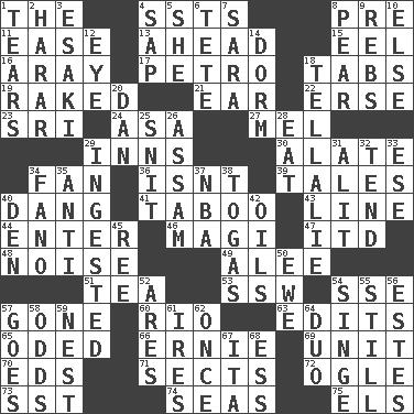 ACROSS 1. Definite Article 4. Fast planes 8. Before (prefix) 11. Relaxation 13. Toward the future 15. Snakelike fish 16. Like ___ of sunshine 17. Stone: prefix 18. Bar bills 19. Moved through 21. Hearing organ 22. Celtic language 23. _ Lanka 24. White ___ sheet 27. Cartoonist voice _ Blanc 29. Taverns 30. Having winglike extensions 34. Avid follower 36. Is not 39. Falsehoods 40. Mild oath, euphamism for damn 41. Off limits 43. Actor's bit 44. Keyboard key 46. Wise men 47. It would 48. Annoying sound 49. Toward shelter 51. Afternoon social gathering 53. Compass dir. 54. Compass dir. 57. Went 60. River (Sp.) 63. Prepares for publication 65. Wrote a lyric poem 66. Bert's buddy 69. A single undivided whole 70. Begley and Asner 71. Religious groups 72. Stare 73. Fast jet (abbr.) 74. Oceans 75. Raised railways DOWN 1. Rends 2. Ethiopian city, capital of Harari 3. 1973 Nobel Price Winner (Physics) Leo 4. Plant excrement 5. A female animal or person 6. False hair 7. "Two Mules for Sister ____" 8. Lightbulb-shaped fruit 9. Confederate soldiers (slang) 10. Otherwise 12. Sight organ 14. Dormintory (informal) 18. Copy Pinocchio 20. Daniel's nick name 25. In a ____ (agitated or irritated) 26. Indian state 28. Ingest 29. Swallowed 31. Came down and settled, as after flight 32. Look after 33. Compass dir. 34. Papal veil 35. Opposed to 37. Basketball assoc. 38. Ancient Roman robes 40. Lair 42. Petroleums 45. To riddle 50. She-sheep 52. Ancient Greek god of war 54. Scorch 55. Free of sound 56. _____ Park, CO 57. Travels 58. Probability 59. Egg locale 61. Angers 62. At one time in the past 64. Superhero pair 67. Call ___ day 68. Curvy letter