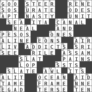 ACROSS 1. Thick or sticky substance 4. Bull 9. French philosopher Descartes 13. Mayday 14. A salt of uric acid 15. Lyric poems 16. Fitting 17. Offensive 18. A single undivided whole 19. Ocean 21. Call ___ day 22. Lessep's creation 24. Actress Patricia 26. Plus 27. Mexican monetary units 29. Singles 30. Place in a line 31. Immeasurably long periods of time 33. Wind 36. 54 in ancient Rome 37. Inveterate users 40. Indian title of respect (Mr.) 41. Perceive with the eye 42. Cause heat under the collar 43. Indian state 45. Narrow board 47. Aches 48. Trim (branches) 49. Fast planes 50. Chalkboard 52. Leather borer 54. ___ a Wonderful Life 56. Came down and settled, as after flight 57. Sea 59. Assist 61. Docile 62. Movie unit 63. Compass dir. 64. Mild oath 65. Laconic 66. "___ Little Indians" DOWN 1. Girls' org. (abbr.) 2. I made a mistake 3. Clearly or manifestly demonstrative 4. Player for Phoenix 5. Drop behind 6. 90 degrees 7. Singer James 8. Marina Del _, California 9. Periods in a boxing match 10. Pulitzer Prize-winning author Ferber 11. Famous astronaut Armstrong 12. Eastern Standard Time (abbr.) 20. Period of immesurable duration 22. 2nd pers. sing. pres. of can (arch.) 23. One (Scot) 25. Toward the sea 27. Friends 28. Writer Wiesel 29. At one time in the past 31. Prepare for publication 32. Petroleum 33. Helper 34. SW Asia republic 35. Basketball hoops 38. Window treatment 39. Plant excrements 44. Suttee (variant) 45. Scheduled 46. Car dealer's back yard 49. Shuts with force 50. Volcanic refuse 51. Pale green bean 52. Land measure 53. Erode 55. Trig term 56. Had dinner 57. Often (poetically) 58. Born 60. Lair