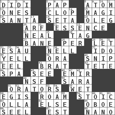 ACROSS 1. "You Light Up My Life" star Conn 5. Infant food 8. Tiny particle 12. Singles 13. Hoof sound 15. Wise men 16. Before Barbara or Clara 18. Bristle 19. Cassini of fashion 20. Sandy's bark 22. Substance 24. Anneal 26. Label 27. Object of repulsion 28. For each 29. Allow 32. He sold his birthright 35. 1994 drama film starring Jodie Foster 37. Wedding promise 38. Shout 39. Mouth or opening 40. Clip 41. Snakelike fish 42. Naughty child 43. Wig 44. Health resort 45. Perceive with the eye 46. Arab leader 49. Overdraft (abbr.) 50. "Two Mules for Sister ____" 51. Speakers 55. Soggy 56. The front part of a cuirass 57. Wander aimlessly 59. Unemotional 63. Rounded earthenware pot or jar 64. Otherwise 65. Mitch Miller's instrument 66. Stitch closed the eyes of (a falcon) 67. Eastern Standard Time (abbr.) 68. Billionth: prefix DOWN 1. Two (Sp.) 2. _ tizzy (2 wds.) 3. Lair 4. Byzantium, centuries later 5. Personal Computers (abbr.) 6. Toward shelter 7. Cooking vessels 8. Amid 9. Baby powder 10. Double curve, resembling the letter S 11. Russian fighter aircraft 14. Soft color 17. Length times width 21. Avid follower 23. Ewer handle 25. Poe poem 28. Food holders 29. Actor's bit 30. Prepare for publication 31. Drink excessively 32. Snake ____ (dice throw) 33. Ooze 34. Silent film actress Nazimova 36. Period 40. Ski resort town in Vermont 42. Prior to 45. Fast jet (abbr.) 47. Opening into something insatiable 48. Angers 49. Relating to the nose 51. Stare at amorously 52. Cause heat under the collar 53. Hero or heavy, e.g. 54. Backtalk 56. Greek goddess of the dawn 58. Was introduced to 60. Chief or king in Benin or Nigeria 61. Electrically charged atom 62. Corporate head (abbr.)