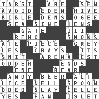 ACROSS 1. Tarsus (plural) 6. "We ___ not amused" (Victoria) 9. Elected rep. 12. Prevent the occurrence of 13. Genesis locale 14. Hub of activity 15. The Good Book 16. Habitations of wild animals 17. Double curve, resembling the letter S 18. Ocean 19. Trig term 20. Coop moms 21. Yard entry 23. One more than two 24. San ____ (Riviera town) 25. Frozen precipitation (plural) 28. Had dinner 30. Part 34. Jennifer or Joel 35. French article 36. Trading vessels 38. It is 39. In a ____ (agitated or irritated) 41. Sports stadium 43. Eastern Standard Time (abbr.) 44. More peculiar 46. Conclusions 48. Compass dir. 49. Bring up, as a child 50. "60 Minutes" Commentator Rooney 51. Fermented drink made from hops 53. Keyboard modifier key 56. Louse (plural) 57. 1994 drama film starring Jodie Foster 58. Soup utensil 60. Wrote a lyric poem 61. Kill 62. Cell (Danish) 63. It is so 64. Air blower 65. Small island DOWN 1. Bar bill 2. Advice 3. Loose flowing garment 4. Fodder prepared in a silo 5. Binary compound 6. An important port of Yemen 7. French philosopher Descartes 8. Followers of ems 9. Seigniories (variant) 10. Nights before holidays 11. Born 13. Singer Brickell 14. Weeding 19. Unemotional 20. Part of HMS, perhaps 22. Electrical Unit 24. Dwellings 26. Soaks 27. System (abbr.) 28. In addition 29. Watch over 31. Epoch 32. 4-wheeled motor vehicle 33. Sight organ 37. Contemptuous expression 40. Looked after 42. Santa ___, CA 45. Marina Del _, California 47. Window treatments 49. Depend 50. Assistant 51. Actor Lugosi 52. Style 54. Hang loosely or laxly 55. Lacquered or enameled metalware 56. Myrna of the movies 57. Overdraft (abbr.) 58. _-fi 59. Remaining after all deductions