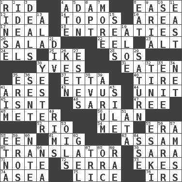ACROSS 1. To free from 4. First of billions? 8. Comfort 12. The main thing one is thinking about 14. Literary convention 16. Type of rug 17. Be tempered by heat 18. Pleas 20. Vegetable dish 22. Snakelike fish 23. The first octave above the treble staff 24. Raised railways 25. D.D.E's nickname 28. Mayday 30. Jacques Cousteau's middle name 31. Ingested 35. Compass dir. 37. Singer James 40. Become fatigued 41. Ancient Greek god of war 42. Mole, birthmark 44. A single undivided whole 45. Is not 46. Indian skirt 47. To sift 48. Distance measurement 50. Uhlan (variant) 52. _ de Janeiro 54. Was introduced to 55. Epoch 58. Car or cant ending 61. Russian fighter aircraft 63. Indian state 65. Interpreter 70. "Two Mules for Sister ____" 71. Observe 72. Spanish missionary in California 73. Supplements with great effort 74. At sea 75. Louse (plural) 76. Big collection agency DOWN 1. Remove soap 2. Standard of perfection 3. Allots cards 4. Had dinner 5. Spanish title 6. Fitting 7. Greater amount 8. Consume 9. Roberta Peters solo 10. Stitch closed the eyes of (a falcon) 11. 90 degrees 13. According to 15. Observes 19. Medicinal plant 21. HTML Container Element 26. Peachy ____! 27. _____ Park, CO 29. Titan orbits this 30. Next before 32. Prong on a fork 33. One of the Great Lakes 34. Fish or hair follower 35. Celtic language 36. Posted 38. Federal power corp. 39. Gold (Symbol: Au) 41. Direct toward a target or goal 43. Filth; sediment 49. Basketball hoops 51. _ moment's notice (2 wds.) 53. Petroleums 55. 1973 Nobel Price Winner (Physics) Leo 56. Less widely known 57. Collect or gather 58. Inactive volcano in Sicily 59. Greek god of love 60. Nathan's nickname 62. Highlander 64. Compass dir. 66. Teachers' org. 67. Three (prefix) 68. The grampus (Milton) 69. Actress Charlotte