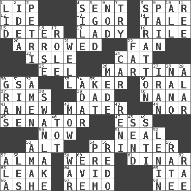 ACROSS 1. Mouth edge 4. Transmitted 8. Coast Guard woman 12. Binary compound 13. Composer Stravinsky 14. Story 15. Prevent from occurring 18. Kenny Rogers chart-topper in '80 19. Cause heat under the collar 20. Moved like an arrow 22. Avid follower 23. Capri or Wight 24. Feline 25. Snakelike fish 26. Chrissie's court nemesis 30. Girls' org. (abbr.) 33. Member of a famous L.A. basketball team 36. Spoken 37. Basketball hoops 39. June honoree 40. Grandmother 41. Afresh 42. Mother 44. And not 45. Legislator 47. Curvy letter 50. At this time 51. Actress Patricia 53. Keyboard modifier key 54. Hard copy producer 57. _ mater 59. Past tense of be (plural) 61. Middle Eastern gold or silver currency 63. Path through which fluid escapes 64. Enthusiastic 65. Call ___ day 66. American tennis player Robert 67. San ____ (Riviera town) 68. Born DOWN 1. Hat (slang) 2. It may be bright or harebrained 3. _ dish (used to culture cells) 4. Drop; flow; fall 5. Mild oath 6. Allow head to fall sleepily 7. Attempt to accomplish something 8. Ski resort town in Vermont 9. Ache 10. Everything 11. To riddle 16. Celtic language 17. Hero or heavy, e.g. 21. Water source 22. At a great distance 24. Automobile 26. Ancient Persian 27. SW Asia republic 28. Billionth: prefix 29. Having or resembling wings 30. Pate de foie ____ 31. Trig term 32. So be it 34. The sixth month of the Jewish calendar 35. Krazy ___ of comics 38. Tchaikovsky ballet 42. Cut the grass 43. Painter Guido (1575-1642) 46. Small child 48. Transmit 49. Suttee (variant) 52. Soviet premier 1918-24 53. Wet nurse 54. Demure 55. Redecorate 56. Pace 57. Insect wing 58. French article 59. Armed conflict 60. Night before a holiday 62. Actress Charlotte