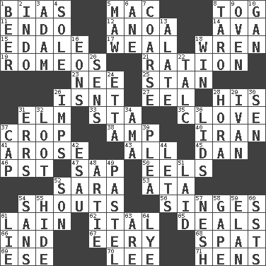 ACROSS 1. Prejudice 5. Apple computer (short form) 8. Coat; cloak 11. Inside; within (prefix) 12. Small Philippine buffalo 14. Actress Gardner 15. Peak District village in England 17. Welt 18. Songbird 19. Lover boys 21. Food allowance for one day 23. Born 25. Comedian Laurel of Laurel & Hardy 26. Is not 27. Snakelike fish 28. Part of HMS, perhaps 31. Shade tree 33. R.R. building 35. Garlic unit 37. Riding implement 38. Electrical Unit 40. SW Asia republic 41. Came up 43. Everything 45. Daniel's nick name 46. Pacific Standard Time (abbr.) 47. Plant excrement 50. Snakelike fish 52. "Two Mules for Sister ____" 53. "One Day ___ Time" 54. Yells 56. Burns superficially 61. (Had) reclined 62. Slanted text style (abbr.) 65. Allots cards 66. Working for oneself (abbr.) 67. Suggestive of the supernatural 68. Petty quarrel 69. Compass dir. 70. Area sheltered from the wind 71. Coop moms DOWN 1. Fermented drink made from hops 2. _ china 3. First man 4. Not divided or shared with others 5. Opening into something insatiable 6. A saturated hydrocarbon 7. Rough 8. Edible starchy tuberous root 9. Baking chamber 10. Separate the seeds from cotton 13. Having winglike extensions 16. Immeasurably long periods of time 18. Acquire through effort 20. Elected reps. 22. Baby powder 24. Singer James 26. Naughty children 28. Israeli folk dance 29. "Terrible" tsar 30. Elected rep. 31. Blunders 32. Plunder 34. Wet nurse (var.) 36. Flaplike coverings 37. Head covering 39. Entreaty 42. He sold his birthright 44. Allows 48. Nick name for Arthur 49. Soft color 51. Put down 52. Male child 54. Without 55. Flintstone garb 57. Delicate 58. Yawn 59. Liveliness 60. Fast planes 61. Whopper 63. "We ___ not amused" (Victoria) 64. Potassium hydroxide