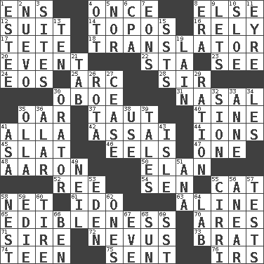 ACROSS 1. Followers of ems 4. At one time in the past 8. Otherwise 12. Set or collection 14. Traditional theme or motif 16. Depend 17. Wig 18. Interpreter 20. Happening 22. R.R. building 23. Perceive with the eye 24. Greek goddess of the dawn 25. Curve 28. Title for a knight 30. Mitch Miller's instrument 31. Rhinal 35. Boat paddle 37. Strained 40. Prong on a fork 41. Silent film actress Nazimova 42. Slender Brazilian palm 44. Charged atoms 45. Narrow board 46. Snakelike fish 47. Single 48. Composer Copland 50. Style 52. To separate or throw off 54. Elected rep. 55. Domesticated feline 58. Remaining after all deductions 61. Wedding promise 63. Place in a line 65. The property of being fit to eat 70. Ancient Greek god of war 71. The founder of a family 72. Mole, birthmark 73. Naughty child 74. Adolescent 75. Emitted 76. Big collection agency DOWN 1. First name in cosmetics 2. New (sp.) 3. Settings 4. Baseball player Mel 5. Not either 6. Tax preparer (abbr.) 7. Immeasurably long periods of time 8. Epoch 9. Allows 10. _ gin 11. Jane of fiction 13. Nine, plus one 15. Fast planes 19. (Had) reclined 21. Keyboard key 26. Round or rotation of duties 27. Desist 29. Food allowance for one day 30. Speaker 32. The Jewish people; Israel 33. Queen of England 1702-14 34. French article 35. Rounded earthenware pot or jar 36. Having or resembling wings 38. Purpose 39. Lies 41. White ___ sheet 43. Capri or Wight 49. Famous astronaut Armstrong 51. Santa ___, CA 53. Genesis locale 55. High-altitude cloud 56. Approach 57. Trials 58. Egg locale 59. Singer Brickell 60. Hoop that covers a wheel 62. Singles 64. Experiment locale 66. Benjamin's nick name 67. Night before a holiday 68. Player for Phoenix 69. Fast jet (abbr.)