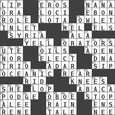 ACROSS 1. Mouth edge 4. Greek god of love 8. Nanny 12. Mouth or opening 13. Venues 14. Inky black, to poets 15. Hero or heavy, e.g. 17. Globular water bottle used in Asia 18. A small or young owl 19. An arm off of a larger body of water 21. Cartoonist voice _ Blanc 23. Raised railways 24. Damascus' land 26. In the manner of 28. Shout 30. Speakers 34. Shoshoni 37. Lubricates 39. An important port of Yemen 40. And not 41. Opt 43. Heredity factor (abbr.) 44. Musical group of three 46. The sixth month of the Jewish calendar 47. Small drink 48. Pertaining to the sea 51. Posterior 54. To free from 55. Leg joints 58. A female animal or person 61. Chop off 63. Phillipine bananalike plant 65. Porridge 67. Mitch Miller's instrument 71. Constrict 72. Toward shelter 73. Water falling in drops from the sky 74. Followers of ems 75. French philosopher Descartes 76. Falsehood 77. Born DOWN 1. Australian parrot (variant) 2. Removes the wrinkles 3. Friendly 4. Pipe bend 5. Friend of Pooh 6. Sep. follower 7. Thailand, formerly 8. ___ Haven, CT 9. Competent 10. Christmas carol 11. Pismires 16. Suggestive of the supernatural 18. Spanish pot 20. Make a knot 22. Ewer handle 25. Medicinal plant 27. "One Day ___ Time" 29. Pale purple color 30. Witty Wilde 31. Likelihood 32. Painter Guido (1575-1642) 33. Fastener 34. To (old English) 35. Torque (variant) 36. One of the Great Lakes 38. Directed 42. Long journey 45. Boat paddle 49. The longest river in the world 50. Wedding promise 52. Santa ___, CA 53. Confederate soldiers (slang) 56. Eroded 57. Biscuitlike quick bread 58. Practice fight 59. Hollow 60. Genesis locale 62. Sweet dark-red dessert wine 64. Domed church section 66. Turn to the right 68. Sound made by sheep 69. Petroleum 70. Compass dir.
