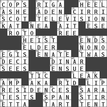 ACROSS 1. 911 reaches them 5. Port city in Latvia 9. Person who is morally reprehensible 13. American tennis player Robert 14. An important port of Yemen 15. High-altitude cloud 16. Highlander 17. Boob tube 19. Krazy ___ of comics 20. Teachers' org. 21. Small island 22. Compass dir. 23. Printing process, for short 25. Portuguese money of account (variant) 26. Robbery 30. Extremities 34. A person who is older than you are 35. Words to Nanette 36. Armor plate that protects the chest 39. Maternal 42. It was, poetically 43. Tenth: prefix 44. Middle Eastern gold or silver currency 46. Observes 47. Take place subsequently 48. Nervous spasm 51. Path through which fluid escapes 54. Electrical Unit 57. Alias (abbr.) 58. To free from 60. Mouth edge 62. Dwellings 65. "Two Mules for Sister ____" 66. Trials 67. Connect, as a bridge 68. Agitate 69. Singer James 70. Small pie 71. Portable shelter DOWN 1. Keg 2. Witty Wilde 3. Picture 4. Put into a specified state 5. Pace 6. It may be bright or harebrained 7. Set 8. Approach 9. Part of HMS, perhaps 10. 4th largest of the Great Lakes 11. Greek god of love 12. Actor's bit 15. Quote 18. Compete 20. Christmas carol 24. College paper 27. Binary compound 28. Elected rep. 29. Barter 30. Main course 31. Immediately 32. Heredity factor (abbr.) 33. Distress signal 36. Begley and Asner 37. Turn to the right 38. Frozen water 40. Metal container 41. Followers of ems 45. Old (Scot.) 48. Small amounts or degrees 49. D.D.E's nickname 50. 2nd pers. sing. pres. of can (arch.) 52. Having winglike extensions 53. Japanese brewing company 54. Johnson of "Laugh-In" 55. Rendezvous 56. Inconspicuous attention getter 58. Tail end 59. Is not 61. Piece 63. Call ___ day 64. Tax preparer (abbr.) 65. Fast jet (abbr.)