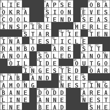 ACROSS 1. Falsehood 4. Domed church section 8. Chief or king in Benin or Nigeria 11. Gumbo ingredient 13. The Jewish people; Israel 14. Nights before holidays 15. Calm and collected 16. Look after 17. Oceans 18. Motivate 21. Haggard of country music 22. Play the lead 23. Standoff 25. "___ Little Indians" 26. _ tizzy (2 wds.) 29. One of the two male reproductive glands 32. Role for Stallone 34. "We ___ not amused" (Victoria) 35. Be seated 38. Small Philippine buffalo 39. Having a sole or soles 41. Soon (poet.) 43. Lubricate 44. Binary compound 45. Outlay 46. Eaten 50. Rowing implement 51. Bar bill 54. Plus 55. Makes supply last 57. Amid 59. Inhabiting a nest 63. Object of repulsion 64. Texas town _ City 67. Type of rug 68. Actor's bit 69. Singer Murray 70. A home for chicks 71. Compass dir. 72. Necklace unit 73. A female animal or person DOWN 1. Venues 2. Picture 3. Greek god of love 4. Michaelmas daisies 5. Sliced dessert 6. Male child 7. Conclude 8. Unconcealed 9. Memphis, Tenn. Street 10. NE Netherlands city 12. High mountains 14. Compass dir. 19. "Tell ____ the Marines!" 20. Actress Charlotte 21. Cartoonist voice _ Blanc 23. Hoop that covers a wheel 24. On the rocks 26. Lyricist Gershwin 27. Billionth: prefix 28. Mine, in Marseilles 30. Stories 31. Son of Isaac 33. Indonesian resort city 36. To the inside or interior of 37. Ancient Roman robe 39. Attach a signature 40. Wrote a lyric poem 42. Not either 45. Lyric poems 47. Tired old horse 48. Watched over 49. Make supply last 51. Eating place 52. At full speed 53. Maid-servant 56. Comedian Laurel of Laurel & Hardy 58. Born 60. Angers 61. Soft 62. Yard entry 64. Apply (a substance) by light strokes 65. Single 66. Heredity factor (abbr.)