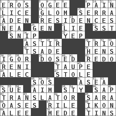 ACROSS 1. Greek god of love 5. Double curve, resembling the letter S 9. Ache 13. Louse (plural) 14. Take by theft 15. Spanish missionary in California 16. An important port of Yemen 17. Dwellings 19. Teachers' org. 20. Commissioned military rank (abbr.) 21. Whopper 22. Fast jet (abbr.) 23. Clip 25. Slangy assent 26. Being in motion 30. Musical group of three 34. Sadhe (variant) 35. Coop moms 36. Russian composer Stravinsky 39. Administered medicine 42. Redecorate 43. Painter Guido (1575-1642) 44. Grayish beige 46. Actor Baldwin 47. Took without asking 48. Mayday 51. Toward the sea 54. Institute legal proceedings 57. Direct toward a target or goal 58. Filthy place 60. Plant excrement 62. Interpreter 65. "Two Mules for Sister ____" 66. Fertile tracts in a desert 67. Cause heat under the collar 68. Picture 69. Toward shelter 70. Ancient Persian 71. Canisters DOWN 1. Liveliness 2. Amusement-park features 3. Sea 4. Elected rep. 5. Legendary monster 6. Small, secluded valley 7. Greek goddess of the dawn 8. Poet Dickinson 9. Fenced enclosure 10. Arches 11. Angers 12. Political cartoonist Thomas 15. Ooze 18. Expire 20. Global Positioning Systems (abbr.) 24. Of or pertaining to medicine 27. Bit 28. Wedding promise 29. Musical pauses 30. Triplets 31. To separate or throw off 32. Indiana (abbr.) 33. Bear (Spanish) 36. Lyricist Gershwin 37. Set 38. Single 40. Erode 41. Superhero pair 45. Romp 48. Backtalk 49. Petroleum 50. Excessive but superficial compliments 52. 1973 Nobel Price Winner (Physics) Leo 53. Composer Copland 54. Portico 55. Mountain range 56. Relaxation 58. Exchanged or delivered for money 59. Relationship diagram 61. Baking dishes 63. Born 64. Standoff 65. Be seated