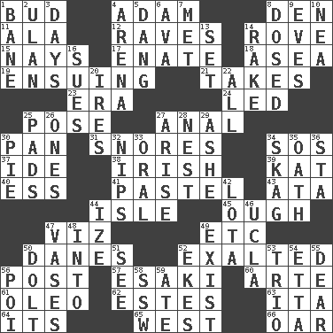 ACROSS 1. Partially opened flower 4. First man 8. Lair 11. Wing 12. All-night dance parties 14. Be footloose 15. Negative votes 17. Related on the mother's side 18. Toward the sea 19. Following as a consequence or result 21. Receives possession of 23. Epoch 24. Directed 25. Introduce or present, as a question 27. Of or related to the anus 30. Baking dish 31. Sounds asleep 34. Distress signal 37. Binary compound 38. From or relating to Ireland 39. Krazy ___ of comics 40. Double-curved letter 41. Soft color 43. _ moment's notice (2 wds.) 44. Capri or Wight 45. Ending for "Through" and "Enough" 47. That is 49. And so on (abbr.) 50. Natives or inhabitants of Denmark 52. Honored 56. Mail 57. 1973 Nobel Price Winner (Physics) Leo 60. Johnson of "Laugh-In" 61. Butter sub 62. _____ Park, CO 63. Call ___ day 64. It is 65. 270 degrees 66. Boat paddle DOWN 1. Object of repulsion 2. ____ Bator, Mongolia 3. 24-hour periods 4. Sports stadium 5. Mild oath, euphamism for damn 6. Actress Gardner 7. Was introduced to 8. Administered medicine 9. Nights before holidays 10. Teachers' org. 13. Put into a specified state 14. Libertine 16. Institutes legal proceedings 20. Angers 22. Everything 25. Groovy apts. 26. Singles 27. Ascend 28. A home for chicks 29. American tennis player Robert 30. Sliced dessert 32. Cuts off 33. Relating to the mouth 34. Heroin 35. Pledge 36. R.R. building 42. Globular water bottle used in Asia 44. Ending with capital 46. Southern CA. univ. 47. Flower holders 48. To the inside or interior of 49. Be 50. Dunce 51. Observe 52. Makes supply last 53. Musical group of three 54. Singer James 55. Letter starter 56. Luau course 58. Compass dir. 59. Had dinner
