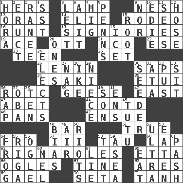 ACROSS 1. Possessive pronoun 5. Desk light 9. Tender 13. Mouths or openings 14. Writer Wiesel 15. Cowboy competition 16. The smallest animal of a litter 17. Seigniories (variant) 19. Adept person 20. Baseball player Mel 21. Non-commissioned officer (abbr.) 22. Compass dir. 23. Adolescent 25. Arrange properly for use 26. Soviet premier 1918-24 30. Plant excrements 34. 1973 Nobel Price Winner (Physics) Leo 35. Needle case 36. College mil. group 39. Honkers 42. 90 degrees 43. Collude with 44. Continued (abbr.) 46. Baking dishes 47. Take place subsequently 48. Long, evenly shaped piece 51. Loyal 54. Back 57. One more than two 58. The 19th letter of the Greek alphabet 60. Infant locale 62. Complicated, petty procedures 65. Singer James 66. Stares at amorously 67. Prong on a fork 68. Ancient Greek god of war 69. Highlander 70. Stalk of a moss capsule 71. Hyperbolic tangent DOWN 1. Israeli folk dance 2. Spew [out] 3. The wife of a rajah (variant) 4. Fast jet (abbr.) 5. For fear that 6. Set down 7. Russian fighter aircraft 8. Actor Sean's family 9. And not 10. Singer Brickell 11. Perceives with the eye 12. Flexible conduit 15. Carrot, for example 18. Frozen water 20. Singles 24. Chooses 27. Tired old horse 28. D.D.E's nickname 29. Sibling's daughter 30. Sowing specialist 31. "One Day ___ Time" 32. Product of festering 33. Be seated 36. Reproach for some lapse or misdeed 37. Chief or king in Benin or Nigeria 38. Nine, plus one 40. Male offspring 41. Followers of ems 45. Ballerina skirt 48. Prejudice 49. Wind 50. Debaucheries 52. Extremist 53. Eroded 54. Toadlike animal 55. Capital of Latvia 56. Stare at amorously 58. Portable shelter 59. At sea 61. Romantic infatuation 63. Cartoonist voice _ Blanc 64. Whopper 65. Erode