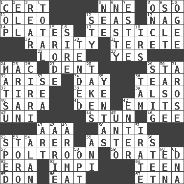 ACROSS 1. Foregone conclusion 5. Compass dir. 8. Bear (Spanish) 11. Margarine 12. Oceans 13. Tired old horse 14. Food holders 17. A testis 19. Noteworthy scarcity 21. Cylindrical with tapered ends 22. Old wives' tales, e.g. 23. It is so 24. Big _ 27. Undesirable depression on a surface 29. R.R. building 32. Originate 34. 24 hours 36. Separate forcefully 37. Hoop that covers a wheel 38. Supplement with great effort 39. In addition 40. "Two Mules for Sister ____" 41. Lair 42. Gives off 43. University (slang) 44. Astound 46. Turn to the right 47. American Automobile Association (abbr.) 50. Opposed to 52. A viewer who gazes fixedly 55. Michaelmas daisies 57. Coward 59. Declaimed 62. Epoch 63. Body of Kaffir warriors 64. Adolescent 65. Spanish title 66. Consume 67. Inactive volcano in Sicily DOWN 1. Police officer (slang) 2. Pipe bend 3. Located in or toward the back 4. Add up to 5. Born 6. Characterized by obscenity 7. First name in cosmetics 8. At one time in the past 9. Table seasoning 10. Double curve, resembling the letter S 12. Filthy place 15. Eat (away) 16. Title for a man of rank and authority 18. Big collection agency 20. Watched over 24. Taiwanese island in East China Sea 25. Believer in; advocate of (suffix) 26. High-altitude cloud 28. Receives possession of 29. Former Milwaukee Brewers owner Bud 30. Clothes sense 31. Came up 33. Ocean 35. Gossips 36. Scottish cap 42. Keyboard key 45. To (old English) 47. Tate display 48. Nest on high 49. Odor 51. Feeling or showing extreme anger 52. Drove too fast 53. "Corrida" creature 54. Actor Alda or Thicke 55. Black tropical American cuckoo 56. Proofreading order 58. Choose 60. Car or cant ending 61. Heredity factor (abbr.)