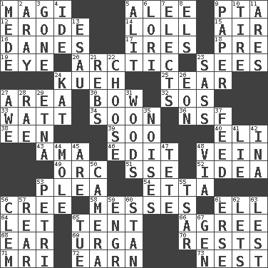 ACROSS 1. Wise men 5. Toward shelter 9. Parent Teacher Association (abbr.) 12. Wear away 14. Hang loosely or laxly 15. Wind 16. Natives or inhabitants of Denmark 17. Angers 18. Before (prefix) 19. Sight organ 20. Northern region 23. Observes 24. Malaysian steamed pastry 25. Pull apart 27. Type of rug 30. Arrow shooter 32. Mayday 33. Electrical Unit 34. Within a short period 36. Overdraft (abbr.) 38. Car or cant ending 39. "Barney Miller" actor Jack 40. Connecticut Ivy Leaguer 43. Nursemaid (var.) 46. Prepare for publication 48. Distinctive style or manner 49. The grampus (Milton) 51. Compass dir. 52. It may be bright or harebrained 53. Entreaty 54. Singer James 56. Algonquian 58. Makes clutter 61. Pipe bend 64. Allow 65. Portable shelter 66. Match 68. Ewer handle 69. Capital and largest city of Mongolia 70. Musical pauses 71. Medical imaging device (abbr.) 72. Merit 73. Egg locale DOWN 1. Ancient Persian 2. Like ___ of sunshine 3. Went 4. Binary compound 5. Set down 6. Australian parrot (variant) 7. Opts 8. Raised railways 9. Some stationery 10. Become fatigued 11. Ancient Greek god of war 13. Son of Isaac 21. Confederate soldiers (slang) 22. Opt 23. Backtalk 24. Krazy ___ of comics 26. Period of immesurable duration 27. Deep reverence 28. Actress Charlotte 29. Inactive volcano in Sicily 31. Forest 35. Annoying sounds 37. Nourish 41. Falsehood 42. _ tizzy (2 wds.) 44. Undercover agent 45. "We ___ not amused" (Victoria) 47. False hair 48. By way of 50. Device for capturing images 53. _ dish (used to culture cells) 55. Russian ruler of old 56. Clement's nick name 57. Tail end 59. Engineer (abbr.) 60. Comedian Laurel of Laurel & Hardy 61. Celtic language 62. Allows 63. For fear that 65. Third day of the wk. 67. Commissioned military rank (abbr.)