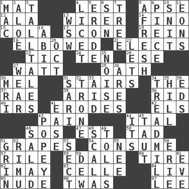 ACROSS 1. Floor protector 4. For fear that 8. Domed church section 12. According to 13. One who wires 14. Fine (Spanish) 15. Root beer relative 17. Biscuitlike quick bread 18. It's straight from the horse's mouth 19. Shoved, as through a crowd 21. Chooses 23. Nervous spasm 24. Nine, plus one 26. Compass dir. 27. Electrical Unit 28. Pledge 30. Cartoonist voice _ Blanc 31. Flight of steps 34. Definite Article 37. Actress Charlotte 38. Get up 39. To free from 40. Big collection agency 41. Eats (away) 42. Raised railways 43. Ache 44. Slanted text style (abbr.) 46. Distress signal 47. Eastern Standard Time (abbr.) 50. Small boy 51. Wine fruits 54. Eat 57. Cause heat under the collar 58. Peak District village in England 60. Hoop that covers a wheel 62. "If ____ say so..." 63. Cell (Danish) 64. 54 in ancient Rome 65. Naked 66. It was, poetically 67. Area sheltered from the wind DOWN 1. Apple computer (short form) 2. _ vera 3. Baron Munchausen's specialties 4. It is permitted: Lat. 5. Eat (away) 6. Elected rep. 7. Relationship diagram 8. Anew 9. Part 10. In a ____ (agitated or irritated) 11. Immeasurably long periods of time 13. Compass dir. 16. "This won't hurt ____!" 20. Sep. follower 22. Allows 25. Annoying sound 27. Put on (as clothing) 29. Ancient Greek god of war 30. Medical imaging device (abbr.) 31. Indian skirt 32. Heavy duty weighing machine 33. Help 34. Excercise machine 35. Land elevation 36. Begley and Asner 41. Comfort 43. Wimpy's pal 44. ___ a Wonderful Life 45. Strained 46. Vegetable dish 48. Any of the three canals of the cochlea 49. For Whom the Bell _____ 51. Smile widely 52. Tall New Zealand timber tree 53. Religious group 55. Born 56. One of the Great Lakes 59. Morning condensation 61. Night before a holiday