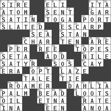 ACROSS 1. Father 5. Biblical high priest 8. Call ___ day 11. Tiny particle 12. Emitted 14. Slender fish 15. Smooth fabric 17. Ancient Roman robe 18. Sweet dark-red dessert wine 19. Scheduled 21. Fortification 23. Ocean 25. Comedian Laurel of Laurel & Hardy 26. Burn to charcoal 27. Nine, plus one 28. "We ___ not amused" (Victoria) 31. For each 33. To separate or throw off 35. Drinks excessively 37. Bristle 38. Increase 40. "Death on the ____" 41. Man with strong sexual desires 43. Mayday 45. Island 46. Epoch 47. Elect 50. Goldbrick 52. Lie 53. Make a knot 54. Nomad 56. A pale violet or amethyst color 61. Inside of hand 62. Necklace unit 65. Plunders 66. Petroleum 67. Inactive volcano in Sicily 68. Pace 69. _ tizzy (2 wds.) 70. Car or cant ending 71. Small Philippine buffalo DOWN 1. Backtalk 2. Slanted text style (abbr.) 3. Round or rotation of duties 4. Send forth 5. Eastern Standard Time (abbr.) 6. Lion 7. Swallow 8. Composer Stravinsky 9. Canvas cover 10. Tate display 13. Clothes sense 16. Tender 18. Baking dish 20. Letter starter 22. Patter 24. Type of rug 26. Supercomputer manufacturer 28. Capital of Western Samoa 29. Trust 30. Compass dir. 31. Lightbulb-shaped fruit 32. Singer James 34. Begley and Asner 36. At one time in the past 37. Compass dir. 39. Stupid person 42. Wander 44. Expressed in words 48. Cadet 49. Cylindrical with tapered ends 51. Ardor 52. Scottish cap 54. Water falling in drops from the sky 55. Spanish pot 57. Israeli folk dance 58. Grant temporary use of 59. "Tell ____ the Marines!" 60. Toward the sea 61. Luau course 63. A saturated hydrocarbon 64. One of the 12 tribes of Israel