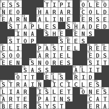 ACROSS 1. Double-curved letter 4. Native american tent (variation) 8. Butter sub 12. Modern: prefix 13. Ethiopian city, capital of Harari 14. Chilled 15. Merit 17. Place in a line 18. Celtic language 19. Paper fasteners 21. Cast a shadow over 23. _ tizzy (2 wds.) 24. A female animal or person 26. Followers of ems 27. Halt 28. Perceives with the eye 30. Connecticut Ivy Leaguer 31. Soft color 34. To sift 37. "Barney Miller" actor Jack 38. Satellite of Uranus 39. Begley and Asner 40. Car or cant ending 41. Sounds asleep 42. Be seated 43. Backtalk 44. Came down and settled, as after flight 46. Baseball player Mel 47. Raised railways 50. To free from 51. Put through a sieve 54. Winter's stalactites 57. One who doesn't tell the truth 58. Small island 60. Washington bills 62. Johnson of "Laugh-In" 63. Aches 64. Domesticated feline 65. Fermented drink made from hops 66. System (abbr.) 67. Epoch DOWN 1. Compass dir. 2. Oceans 3. Determination 4. Falsehoods 5. From or relating to Ireland 6. Baking dish 7. Angers 8. Seas 9. Domineers 10. Otherwise 11. Wrote a lyric poem 13. Actor Linden 16. Billionth: prefix 20. Infant food 22. Person who is morally reprehensible 25. First name in cosmetics 27. A type of plum 29. Snakelike fish 30. Compass dir. 31. Baking dishes 32. Came up 33. Title for a knight 34. Dwelling 35. Prepare for publication 36. Eastern Standard Time (abbr.) 41. Suttee (variant) 43. A viewer who gazes fixedly 44. Curve 45. _ and Stitch 46. Declaim 48. Ms. Damita and namesakes 49. Odor 51. Broad, flat, thick piece 52. Hoop that covers a wheel 53. Cuts off 55. It is 56. Wither 59. Declare 61. R.R. building