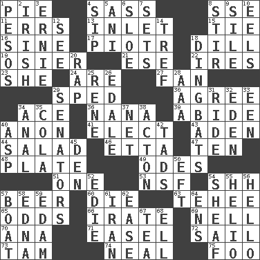 ACROSS 1. Sliced dessert 4. Backtalk 8. Compass dir. 11. Blunders 13. An arm off of a larger body of water 15. Make a knot 16. Trig term 17. Peter (Polish) 18. Deli pickle 19. Flexible twig of a willow tree 21. Compass dir. 22. Angers 23. A female animal or person 24. "We ___ not amused" (Victoria) 27. Avid follower 29. Drove too fast 30. Match 34. Adept person 36. Nanny 39. Stay 40. Soon (poet.) 41. Choose 43. An important port of Yemen 44. Vegetable dish 46. Singer James 47. Nine, plus one 48. Food holder 49. Lyric poems 51. Single 53. Science/research agcy. 54. Quiet! 57. Fermented drink made from hops 60. Pass on 63. Giggle 65. Likelihood 66. Feeling or showing extreme anger 69. 1994 drama film starring Jodie Foster 70. Santa ___, CA 71. Artist's stand 72. Travel by water 73. Scottish cap 74. Actress Patricia 75. Egg _ yung DOWN 1. Mexican monetary units 2. From or relating to Ireland 3. Bert's buddy 4. Small drink 5. Cuckoo 6. A type of plum 7. Puts into a specified state 8. Disorderly outburst 9. Filth; sediment 10. Snakelike fish 12. Observe 14. Not kosher 18. Empty-headed or silly people 20. Hit sharply and swiftly 25. French philosopher Descartes 26. Peak District village in England 28. Auto club (abbr.) 29. Elected representatives 31. Travel on an animal 32. Paradise 33. Car or cant ending 34. Of or related to the anus 35. Root beer relative 37. Fish or hair follower 38. Gambison 40. Cleo's killer 42. Small boys 45. Lair 50. Lizard (obsolete) 52. Singer Brickell 54. Archer's quiver 55. Sun: prefix 56. Phone greeting 57. Water vessel 58. Pulitzer Prize-winning author Ferber 59. Dutch treat 61. SW Asia republic 62. Relaxation 64. Followers of ems 67. Afternoon social gathering 68. Pipe bend