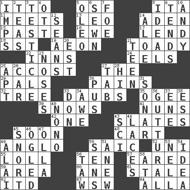 ACROSS 1. "Tell ____ the Marines!" 5. Order of Saint Francis (abbr.) 8. Call ___ day 11. Confronts 13. Lion 14. Arabian gulf 15. Thick mixture 16. She-sheep 17. Grant temporary use of 18. Fast jet (abbr.) 19. Period of immesurable duration 21. Sycophant 22. Taverns 24. Snakelike fish 25. Buttonhole 27. Definite Article 29. Friends 30. Aches 32. Relationship diagram 33. Applies to a surface 35. Double curve, resembling the letter S 39. Frozen precipitation (plural) 41. Religious women 42. Single 43. Chalkboards 45. Within a short period 48. Draw slowly or heavily 49. White American of non-Hispanic descent 50. Ketch in the Levant 52. Single; one (prefix) 55. Hang loosely or laxly 56. Nine, plus one 57. Having ears or earlike features 59. Length times width 60. One (Scot) 61. Showing deterioration from age 62. It would 63. Compass dir. 64. Silent film actress Nazimova DOWN 1. Naughty children 2. Afternoon social gatherings 3. A testis 4. Baseball player Mel 5. Butter sub 6. Stitched 7. Enemy 8. Standard of perfection 9. Looks after 10. Actor Griffith 12. Actors Connery and Penn 14. _ vera 20. Eastern Standard Time (abbr.) 21. Adolescent 23. Olfactory organs 25. Fitting 26. Auto 27. Keyboard key 28. Part of HMS, perhaps 30. Fluid product of inflammation 31. Echolocation 33. Spanish title 34. Deep reverence 36. From the throat 37. Compass dir. 38. Curvy letter 40. Words to Nanette 43. _-fi 44. Shoestrings 45. Derisive sound 46. Stared 47. Spanish pot 49. Jai ____ 50. Elected reps. 51. Afresh 53. 1994 drama film starring Jodie Foster 54. It may be bright or harebrained 56. The 23rd letter of the Hebrew alphabet 58. _ moment's notice (2 wds.)