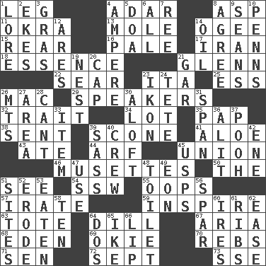 ACROSS 1. Part of a journey 4. The sixth month of the Jewish calendar 8. Viper 11. Gumbo ingredient 13. Undercover agent 14. Double curve, resembling the letter S 15. Tail end 16. Diluted with white 17. SW Asia republic 18. Center 21. American astronaut and politician John 22. Shrivel 23. Call ___ day 25. Double-curved letter 26. Apple computer (short form) 29. Orators 32. Distinguishing feature 34. Car dealer's back yard 35. Infant food 38. Posted 39. Biscuitlike quick bread 41. Medicinal plant 43. Had dinner 44. Sandy's bark 45. The state of being joined or united 46. French bagpipes 50. Definite Article 51. Observe 54. Compass dir. 55. I made a mistake 57. Feeling or showing extreme anger 59. Heighten or intensify 63. Carry 64. Deli pickle 67. Operatic vocal solo 68. Genesis locale 69. Migrant worker of the '30s 70. Confederate soldiers (slang) 71. Elected rep. 72. Back-to-school mo. 73. Compass dir. DOWN 1. Old wives' tales, e.g. 2. Makes supply last 3. Pate de foie ____ 4. Electrical Unit 5. ___ good deed 6. 100% 7. To riddle 8. Match 9. Actors Connery and Penn 10. Actor Sean's family 12. Ancient Greek god of war 14. Lubricate 19. Egg locale 20. Head covering 21. Slender fish 23. Picture 24. False hair 26. Mountains (abbr.) 27. Length times width 28. Patter 30. Upward 31. Connect, as a bridge 33. A distinct part 36. Came down and settled, as after flight 37. "Silly old bear" 39. Backtalk 40. Ship's personnel 42. Compass dir. 45. United States Postal Service (abbr.) 47. Purpose 48. Bathroom plumbing fixture 49. A really long time 51. Locates 52. Eat (away) 53. Consumed 56. Practice fight 58. Nine, plus one 60. Angers 61. Teases 62. Comfort 64. Two (Sp.) 65. Mamie's husband 66. Mouth edge